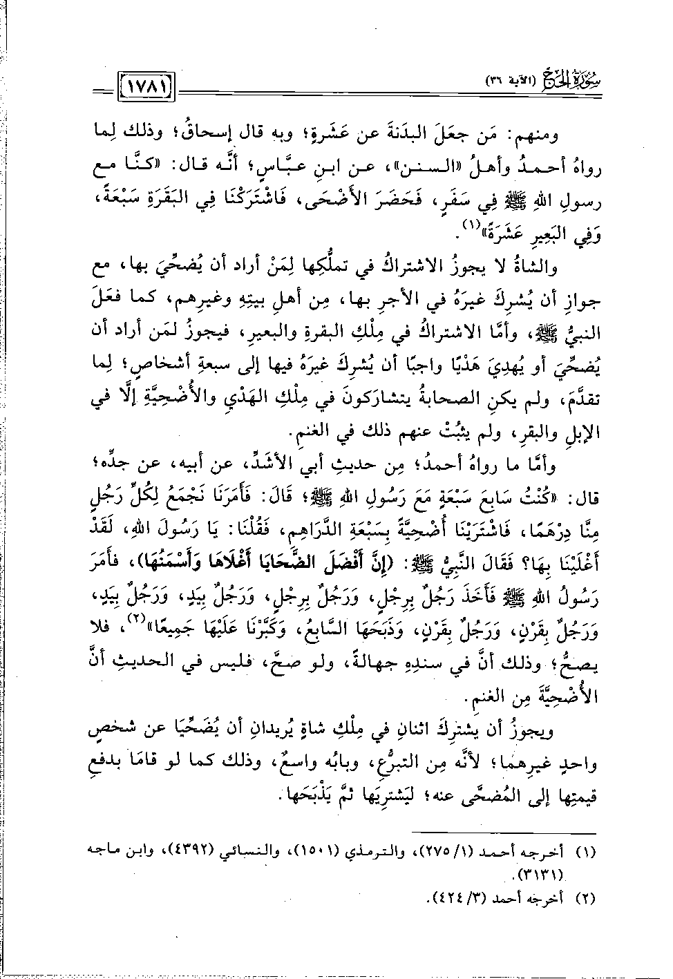 وأمَّا ما رواهُ أحمدُ؛ مِن حديثِ أبي الأشَدِّ، عن أبيه، عن جدِّه؛ قال: "كنْتُ سَابعَ سَبْعَةٍ مَعَ رَسولِ اللَّهِ -صلى اللَّه عليه وسلم-؛ قَالَ: فَأَمَرَنَا نَجمَعُ لِكُلِّ رَجُلِ مِنَّا دِرْهَمًا، فَاشْتَرَيْنَا أُضْحِيَّةً بِسبْعَةِ الدَّرَاهِمِ، فَقُلْنَا: يَا رَسُولَ اللَّهِ، لَقَدْ أَغْلَيْنَا بِهَا؟ فَقَالَ النَّبِيُّ -صلى اللَّه عليه وسلم-: (إِنَّ أَفْضَلَ الضَّحَايَا أَغْلَاهَا وَأَسْمَنُهَا)، فأَمَرَ رَسُولُ اللَّهِ -صلى اللَّه عليه وسلم- فَأَخَذَ رَجلٌ بِرِجْلٍ، وَرَجُلٌ بِرِجْلٍ، وَرَجُلٌ بِيَدٍ، وَرَجُلٌ بِيَدٍ، وَرَجُلٌ بِقَرْنٍ، وَرَجُلٌ بِقَرْنٍ، وَذَبَحَهَا السَّابعُ، وَكَبَّرْنَا عَلَيْهَا جَمِيعًا" (٢)، فلا يصحَّ؛ وذلك أنَّ في سندِهِ جهالةً، ولو صحَّ، فليس في الحديثِ أنَّ الأُضْحِيَّةَ مِن الغنمِ.