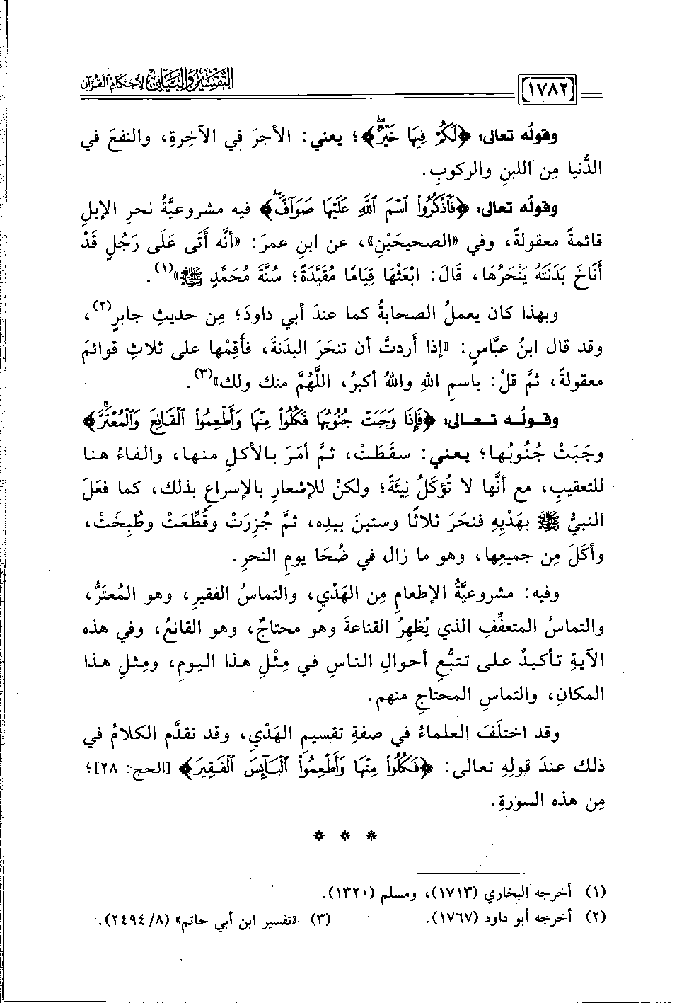 وقولُه تعالى: {فَاذْكُرُوا اسْمَ اللَّهِ عَلَيْهَا صَوَافَّ} فيه مشروعيَّةُ نحرِ الإبلِ قائمةً معقولةً، وفي "الصحيحَيْنِ"، عن ابنِ عمرَ: "أنَّه أَتَى عَلَى رَجُلِ قَدْ أَنَاخَ بَدَنَتَهُ يَنْحَرُهَا، قَالَ: ابْعَثْها قِيامًا مُقَيَّدَةً؛ سُنُّةَ مُحَمَّدٍ -صلى اللَّه عليه وسلم-" (١).