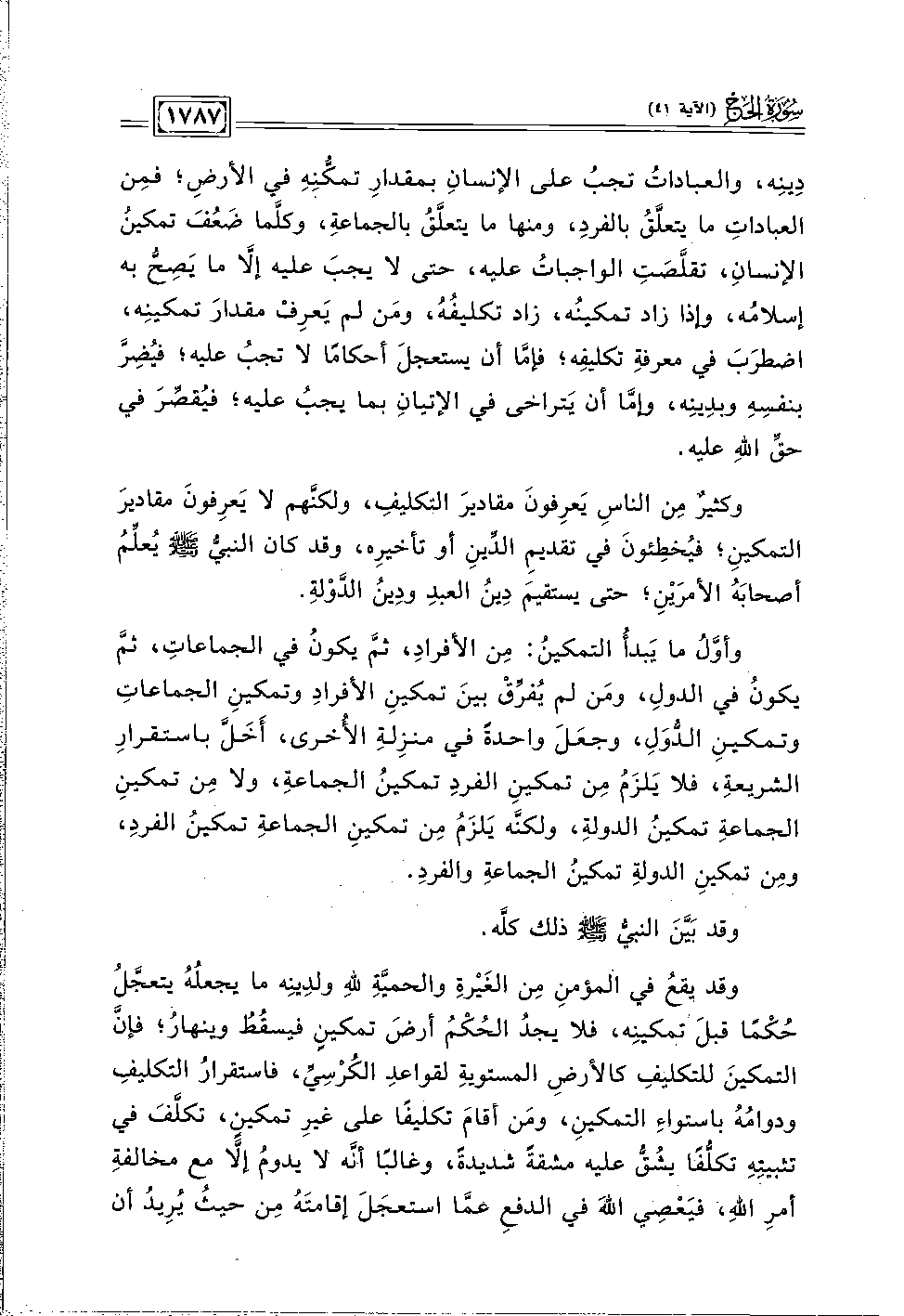 وأوَّلُ ما يَبدأُ التمكينُ: مِن الأفرادِ، ثمَّ يكونُ في الجماعاتِ، ثمَّ يكونُ في الدولِ، ومَن لم يُفرِّقْ بينَ تمكينِ الأفرادِ وتمكينِ الجماعاتِ وتمكينِ الدُّوَلِ، وجعَلَ واحدةً في منزِلةِ الأُخرى، أَخَلَّ باستقرارِ الشريعةِ، فلا يَلزَمُ مِن تمكيِن الفردِ تمكينُ الجماعةِ، ولا مِن تمكينِ الجماعةِ تمكينُ الدولةِ، ولكنَّه يَلزَمُ مِن تمكينِ الجماعةِ تمكينُ الفردِ، ومِن تمكينِ الدولةِ تمكينُ الجماعةِ والفردِ.