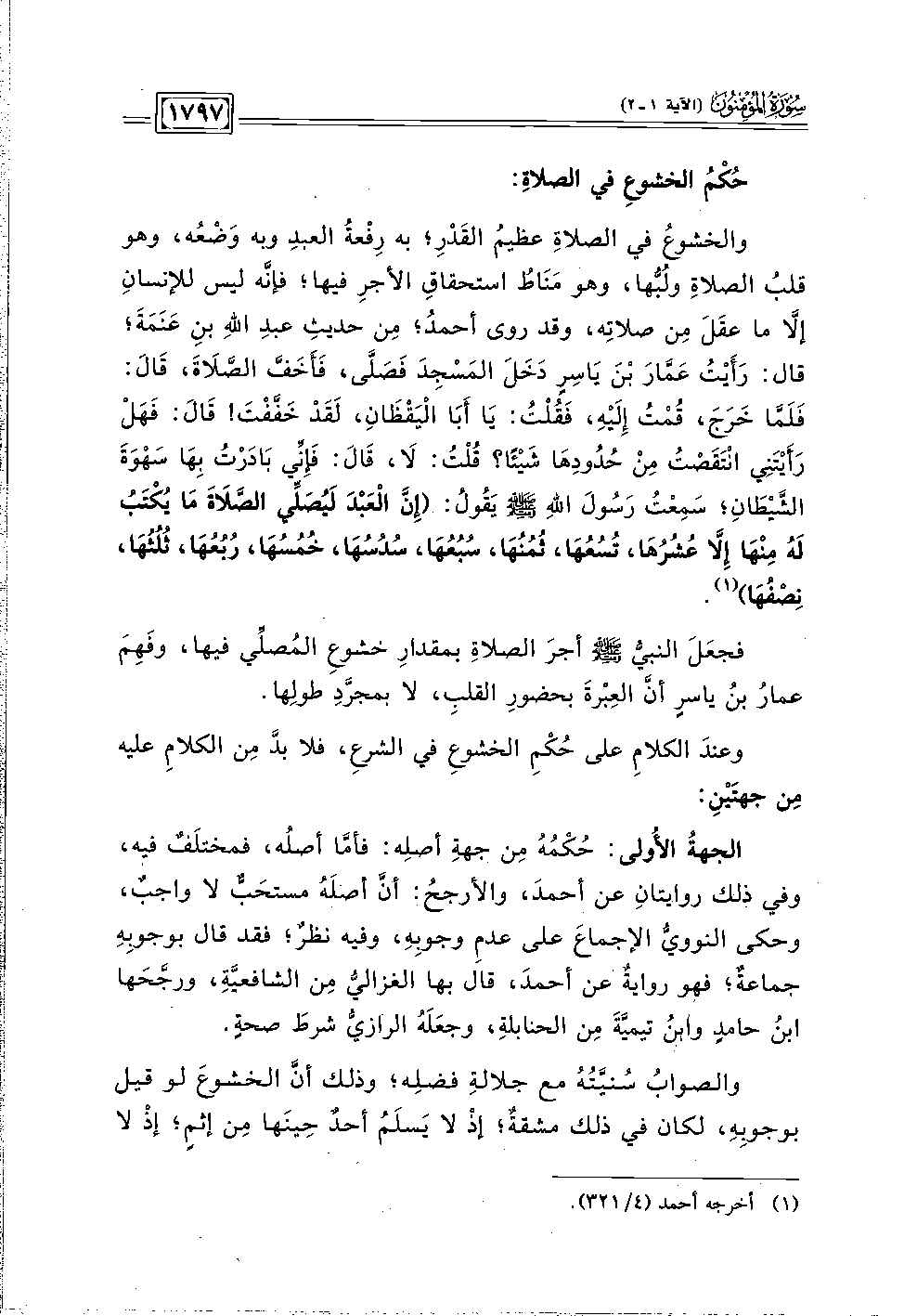 والصوابُ سُنيَّتُهُ مع جلالةِ فضلِه؛ وذلك أنَّ الخشوعَ لو قيل بوجوبِهِ، لكان في ذلك مشقةٌ؛ إذْ لا يَسلَمُ أحدٌ حِينَها مِن إثمٍ، إذْ لا