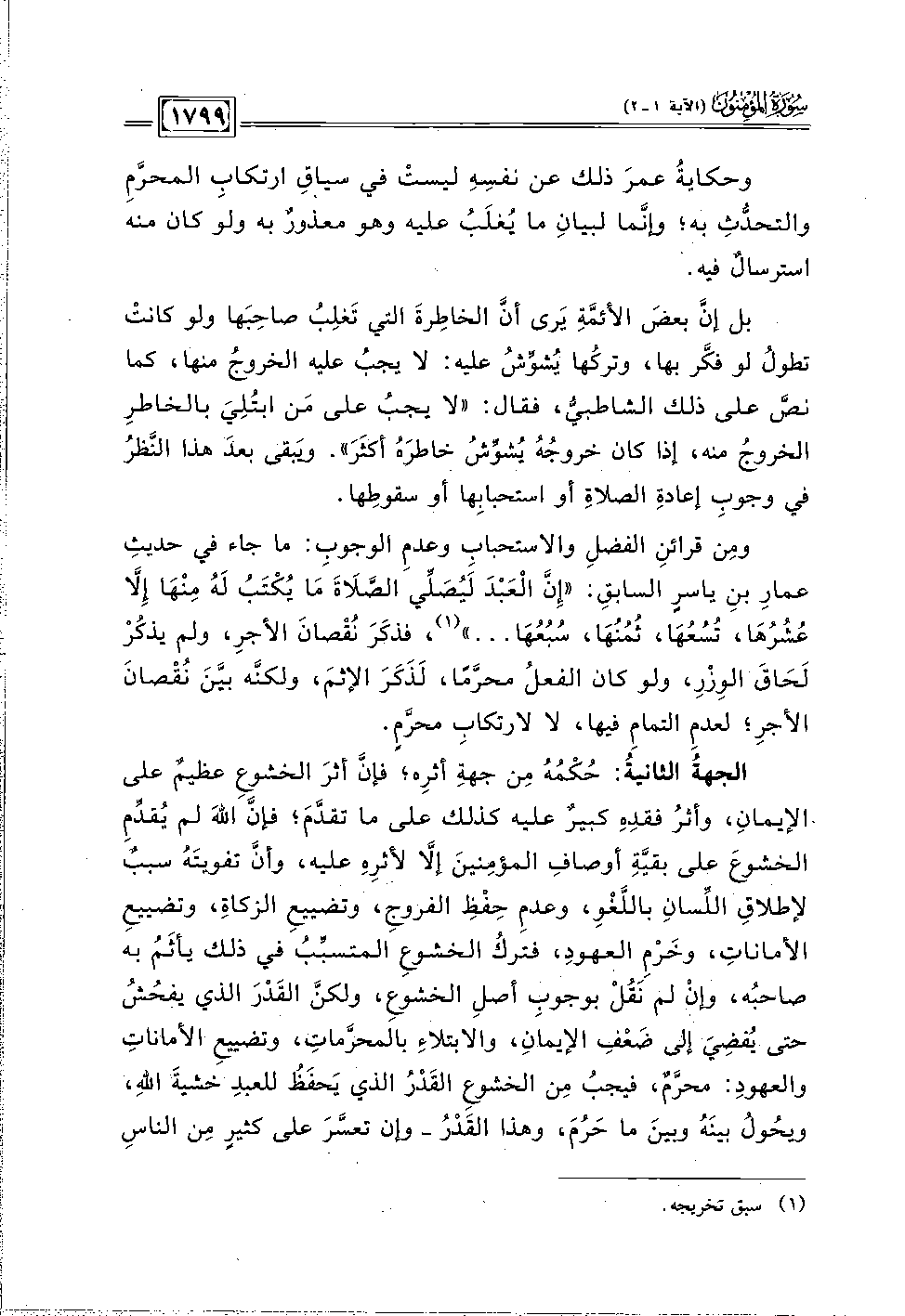 الجهةُ الثانيةُ: حُكْمُهُ مِن جهةِ أثرِه؛ فإنَّ أثرَ الخشوعِ عظيمٌ على الإيمانِ، وأثرُ فقدِهِ كبيرٌ عليه كذلك على ما تقدَّمَ؛ فإنَّ اللَّهَ لم يُقدَّمِ الخشوعَ على بقيَّةِ أوصافِ المؤمِنينَ إلَّا لأثرِهِ عليه، وأنَّ تفويتَهُ سببٌ لإطلاقِ اللِّسانِ باللَّغْوِ، وعدمِ حِفْظِ الفروجِ، وتضييعِ الزكاةِ، وتضييعِ الأماناتِ، وخَرْمِ العهودِ، فتركُ الخشوعِ المتسبِّبُ في ذلك يأثَمُ به صاحبُه، وإنْ لم نَقُلْ بوجوبِ أصلِ الخشوعِ، ولكنَّ القَدْرَ الذي يفحُشُ حتى يُفضِيَ إلى ضَعْفِ الإيمانِ، والابتلاءِ بالمحرَّماتِ، وتضييعِ الأماناتِ والعهودِ: محرَّمٌ، فيجبُ مِن الخشوعِ القَدْرُ الذى يَحفَظُ للعبدِ خشيةَ اللَّهِ، ويحُولُ بينَهُ وبينَ ما حَرُمَ، وهذا القَدْرُ -وإن تعسَّرَ على كثيرٍ مِن الناسِ