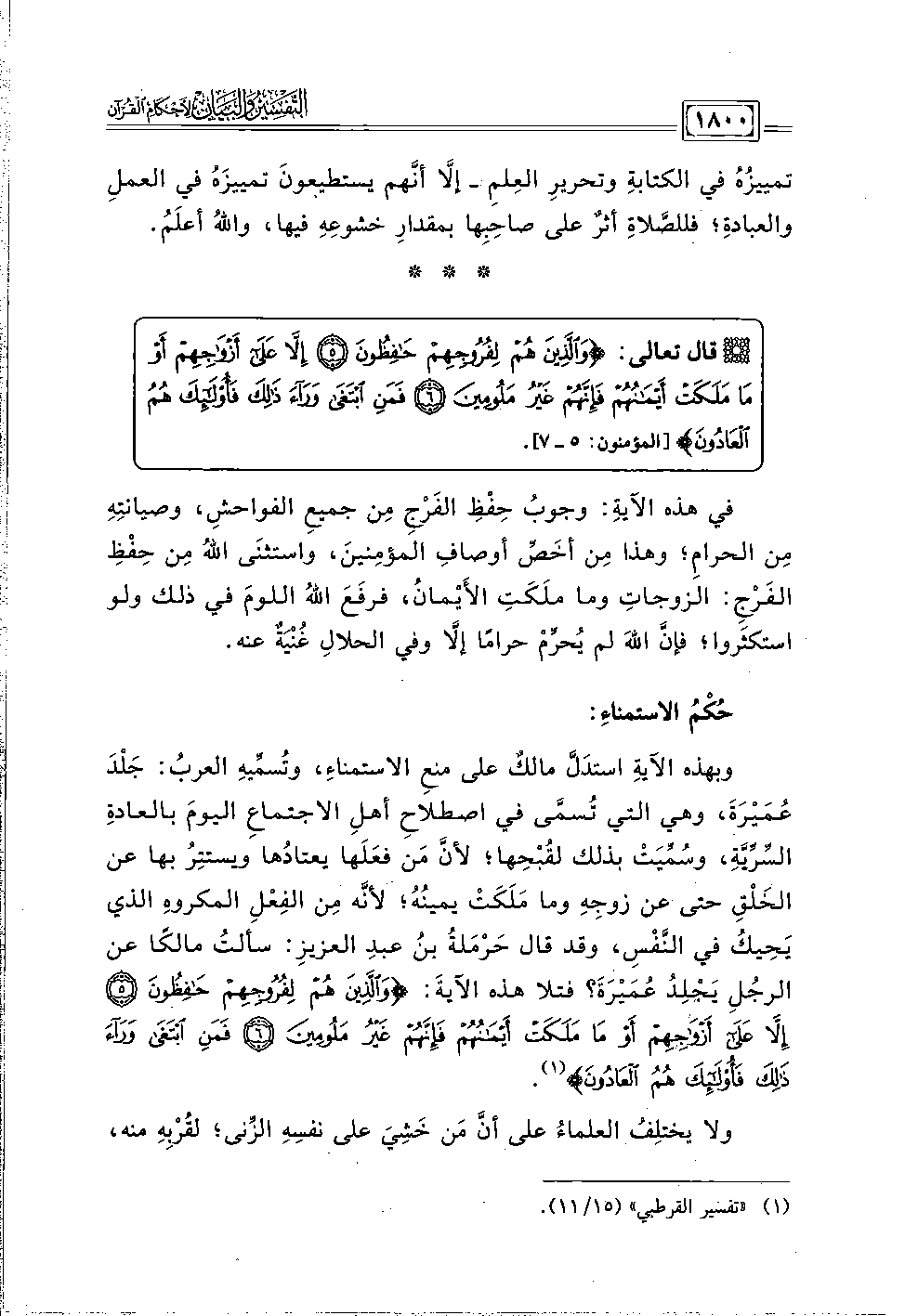 وبهذه الآيةِ استدَلَّ مالكٌ على منعِ الاستمناءِ، وتُسمِّيهِ العربُ: جَلْدَ عُمَيْرَةَ، وهي التي تُسمَّى في اصطلاحِ أهلِ الاجتماعِ اليومَ بالعادةِ السِّرِّيَّةِ، وسُمِّيَتْ بذلك لقُبْحِها؛ لأنَّ مَن فعَلَها يعتادُها ويستتِرُ بها عن الخَلْقِ حتى عن زوجِهِ وما مَلَكَتْ يمينُهُ؛ لأنَّه مِن الفِعْلِ المكروهِ الذي يَحِيكُ في النَّفْسِ، وقد قال حَرْمَلةُ بنُ عبدِ العزيزِ: سألتُ مالكًا عن الرجُلِ يَجْلِدُ عُمَيْرَةَ؟ فتلا هذه الآية: {وَالَّذِينَ هُمْ لِفُرُوجِهِمْ حَافِظُونَ (٥) إِلَّا عَلَى أَزْوَاجِهِمْ أَوْ مَا مَلَكَتْ أَيْمَانُهُمْ فَإِنَّهُمْ غَيْرُ مَلُومِينَ (٦) فَمَنِ ابْتَغَى وَرَاءَ ذَلِكَ فَأُولَئِكَ هُمُ الْعَادُونَ} (١).