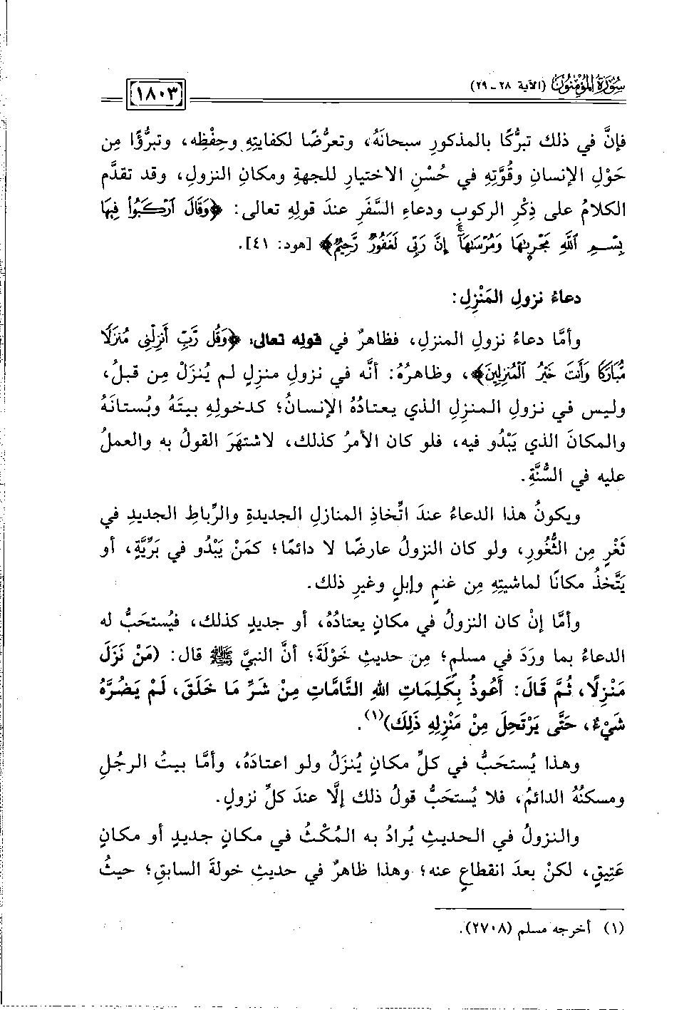 وأمَّا دعاءُ نزولِ المنزلِ، فظاهرٌ في قولِه تعالى: {وَقُلْ رَبِّ أَنْزِلْنِي مُنْزَلًا مُبَارَكًا وَأَنْتَ خَيْرُ الْمُنْزِلِينَ (٢٩)}، وظاهرُهُ: أنَّه في نزولِ منزِلٍ لم يُنزَلْ مِن قبلُ، وليس في نزولِ المنزِلِ الذي يعتادُةُ الإنسانُ؛ كدخولِهِ بيتَهُ وبُستانَهُ والمكانَ الذي يَبْدُو فيه، فلو كان الأمرُ كذلك، لاشتهَرَ القولُ به والعملُ عليه في السُّنَّة.