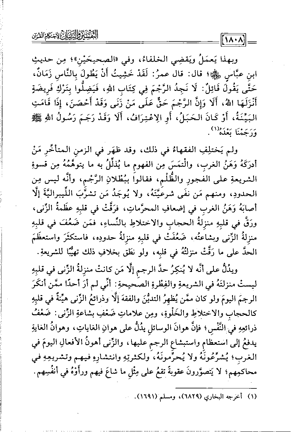 ولم يَختلِفِ الفقهاءُ في ذلك، وقد ظهَر في الزمنِ المتأخِّرِ مَنْ أدرَكَهُ وَهَنُ الغربِ، والْتمَسَ مِن الفهومِ ما يُذلِّلُ به ما يتوهَّمُهُ من قسوةِ الشريعةِ على الفجورِ والظُّلْمِ، فقالوا ببُطْلانِ الرَّجْمِ، وأنَّه ليس مِن الحدودِ، ومنهم مَن نفَى شرعيَّتَةً، ولا يُوجَدُ مَن تشرَّبَ اللَّيبراليَّةَ إلَّا أصابَهُ وَهَنُ الغربِ في إضعافِ المحرَّماتِ، فرَقَّتْ في قلبِهِ عظَمةُ الزِّنى، ورَقَّ في قلبِهِ منزِلةُ الحجابِ والاختلاطِ بالنِّساءِ، فمَن ضَعُفَ في قلبِهِ منزِلةُ الزِّنى وبشاعتُه، ضَعُفَتْ في قلبِهِ منزِلةُ حدودِه، فاستكثَرَ واستعظَمَ الحدَّ على ما رَقَّت منزلتُهُ في قلبِه، ولو نطَق بخلاتِ ذلك تهيُّبًا للشريعةِ.