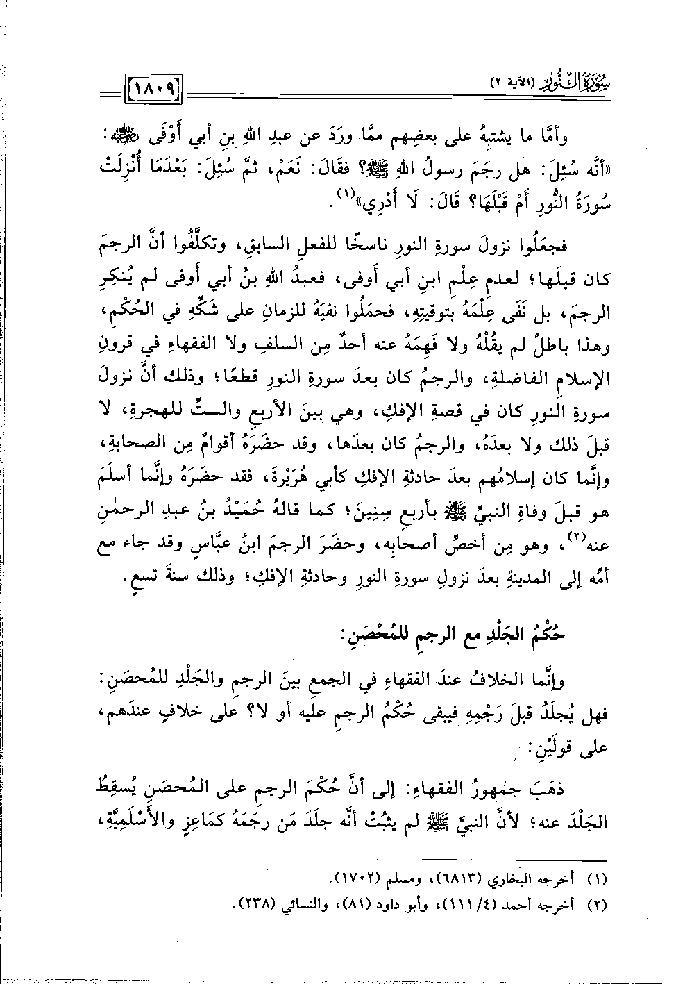 فجعَلُوا نزولَ سورةِ النورِ ناسخًا للفعلِ السابقِ، وتكلَّفُوا أنَّ الرجمَ كان قبلَها؛ لعدمِ عِلْمِ ابنِ أبي أَوفى، فعبدُ اللَّهِ بنُ أبي أَوفى لم يُنكِرِ الرجمَ، بل نَفَى عِلْمَهُ بتوقيتِهِ، فحمَلُوا نفيَهُ للزمانِ على شَكِّهِ في الحُكْمِ، وهذا باطلٌ لم يقُلْهُ ولا فَهِمَهُ عنه أحدٌ مِن السلفِ ولا الفقهاءِ في قرونِ الإسلامِ الفاضلةِ، والرجمُ كان بعدَ سورةِ النورِ قطعًا؛ وذلك أنَّ نزولَ سورةِ النورِ كان في قصةِ الإفكِ، وهي بينَ الأربعِ والستِّ للهجرةِ، لا قبلَ ذلك ولا بعدَهُ، والرجمُ كان بعدَها، وقد حضَرَهُ أقوامٌ مِن الصحابةِ، وإنَّما كان إسلامُهم بعدَ حادثةِ الإفكِ كأبي هُرَيْرةَ، فقد حضَرَهُ وإنَّما أسلَمَ هو قبلَ وفاةِ النبيِّ -صلى اللَّه عليه وسلم- بأربعِ سِنِينَ؛ كما قالهُ حُمَيْدُ بنُ عبدِ الرحمنِ عنه (٢)، وهو مِن أخصِّ أصحابِه، وحضَرَ الرجمَ ابنُ عبَّاسٍ وقد جاء مع أمِّه إلى المدينةِ بعدَ نزولِ سورةِ النورِ وحادثةِ الإفكِ؛ وذلك سنةَ تسعٍ.