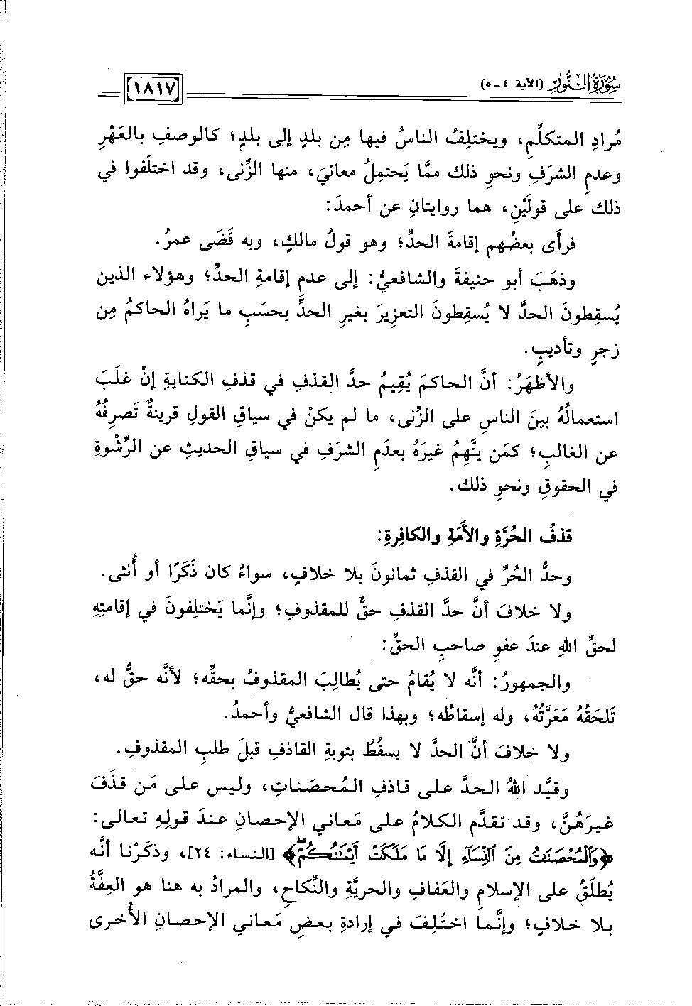 وقيَّد اللَّهُ الحدَّ على قاذفِ المُحصَناتِ، وليس على مَن قذَفَ غيرَهُنَّ، وقد تقدَّم الكلامُ على مَعاني الإحصانِ عندَ قولِهِ تعالى: {وَالْمُحْصَنَاتُ مِنَ النِّسَاءِ إِلَّا مَا مَلَكَتْ أَيْمَانُكُمْ} [النساء: ٢٤]، وذكَرْنا أنَّه يُطلَقُ على الإسلامِ والعَفافِ والحريَّةِ والنِّكاحِ، والمرادُ به هنا هو العِفَّةُ بلا خلافٍ؛ وإنَّما اختُلِفَ في إرادةِ بعضِ مَعاني الإحصانِ الأُخرى