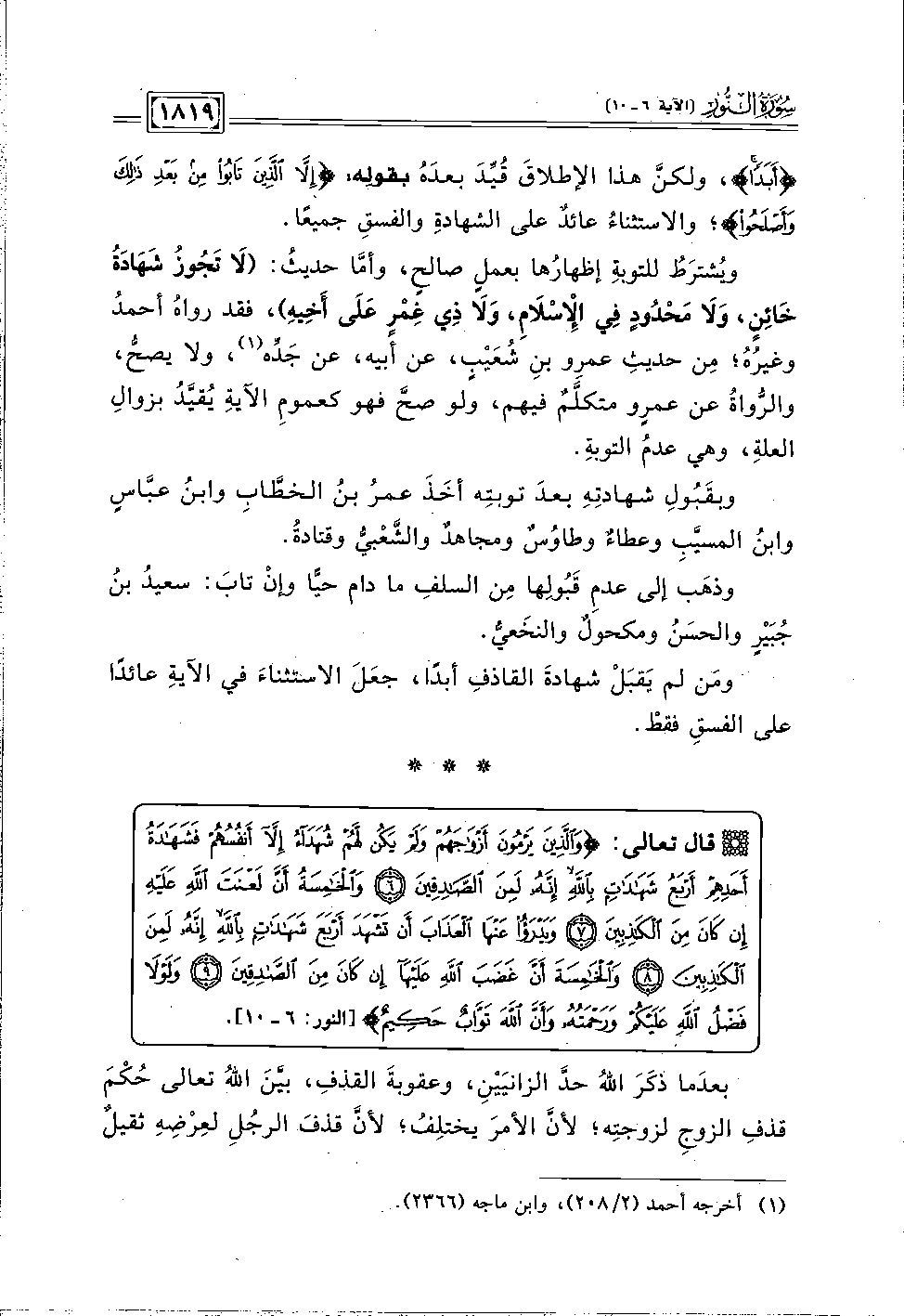 ويُشترَطُ للتوبةِ إظهارُها بعملٍ صالحٍ، وأمَّا حديثُ: (لَا تَجُوزُ شَهَادَةُ خَائِنٍ، وَلَا مَحْدُودٍ فِي الْإِسْلَامِ، وَلَا ذِي غِمْرٍ عَلَى أَخِيهِ)، فقد رواهُ أحمدُ وغيرُهُ؛ مِن حديثِ عمرِو بنِ شُعَيْبٍ، عن أبيه، عن جَدِّه (١)، ولا يصحُّ، والرُّواةُ عن عمرٍو متكلَّمٌ فيهم، ولو صحَّ فهو كعمومِ الآيةِ يُقيَّدُ بزوالِ العلةِ، وهي عدمُ التوبةِ.