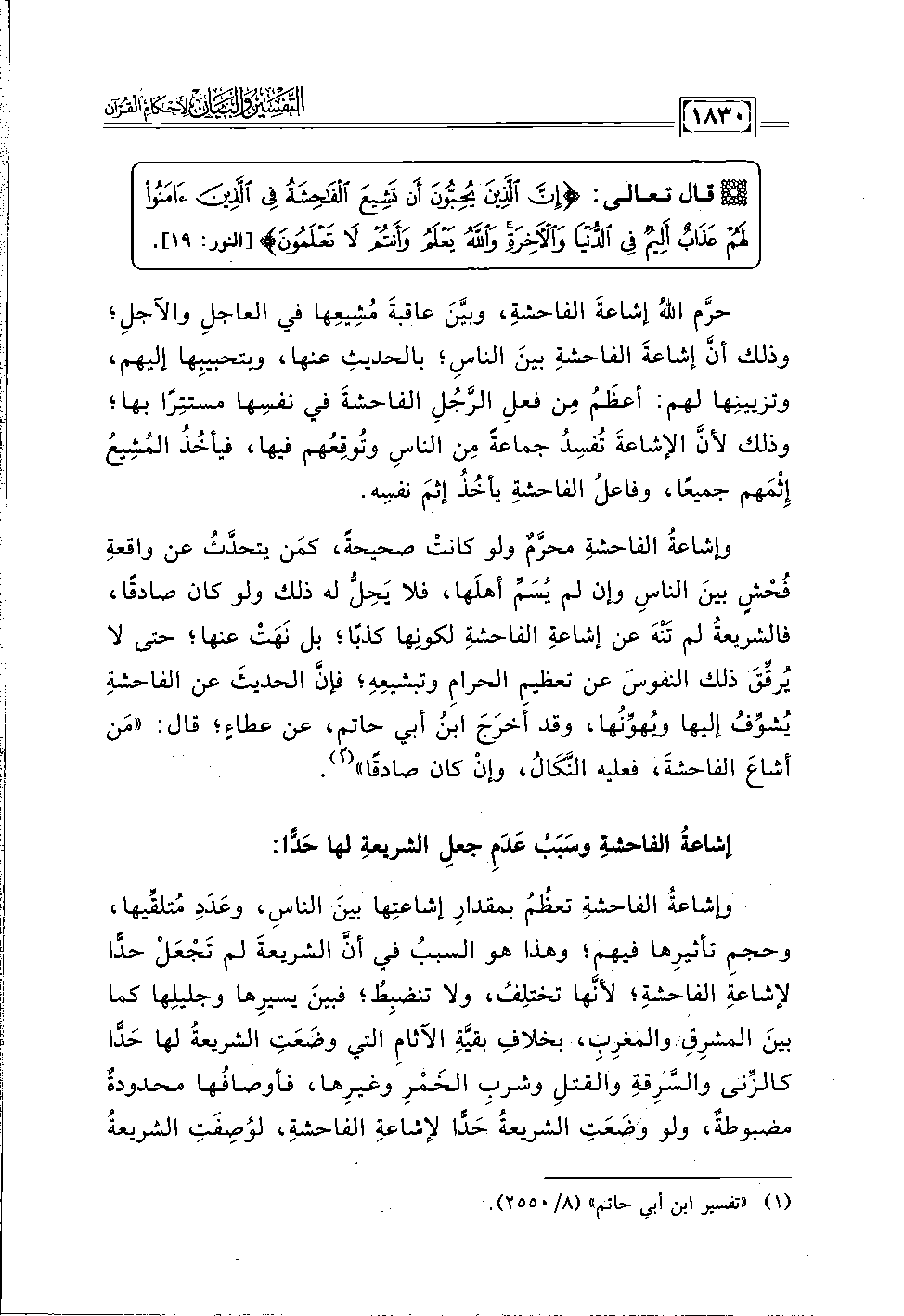 وإشاعةُ الفاحشةِ تعظُمُ بمقدارِ إشاعتِها بينَ الناسِ، وعَدَدِ مُتلقِّيها، وحجمِ تأثيرِها فيهم؛ وهذا هو السببُ في أنَّ الشريعةَ لم تَجْعَلْ حدًّا لإشاعةِ الفاحشةِ؛ لأنَّها تختلِفُ، ولا تنضبِطُ؛ فبينَ يسيرِها وجليلِها كما بينَ المشرِقِ والمغرِبِ، بخلافِ بقيَّةِ الآثامِ التي وضَعَتِ الشريعةُ لها حَدًّا كالزِّنى والسَّرِقةِ والقتلِ وشربِ الخَمرِ وغيرِها، فأوصافُها محدودةٌ مضبوطةٌ، ولو وضَعَتِ الشريعةُ حَدًّا لإشاعةِ الفاحشةِ، لوُصِفَتِ الشريعةُ