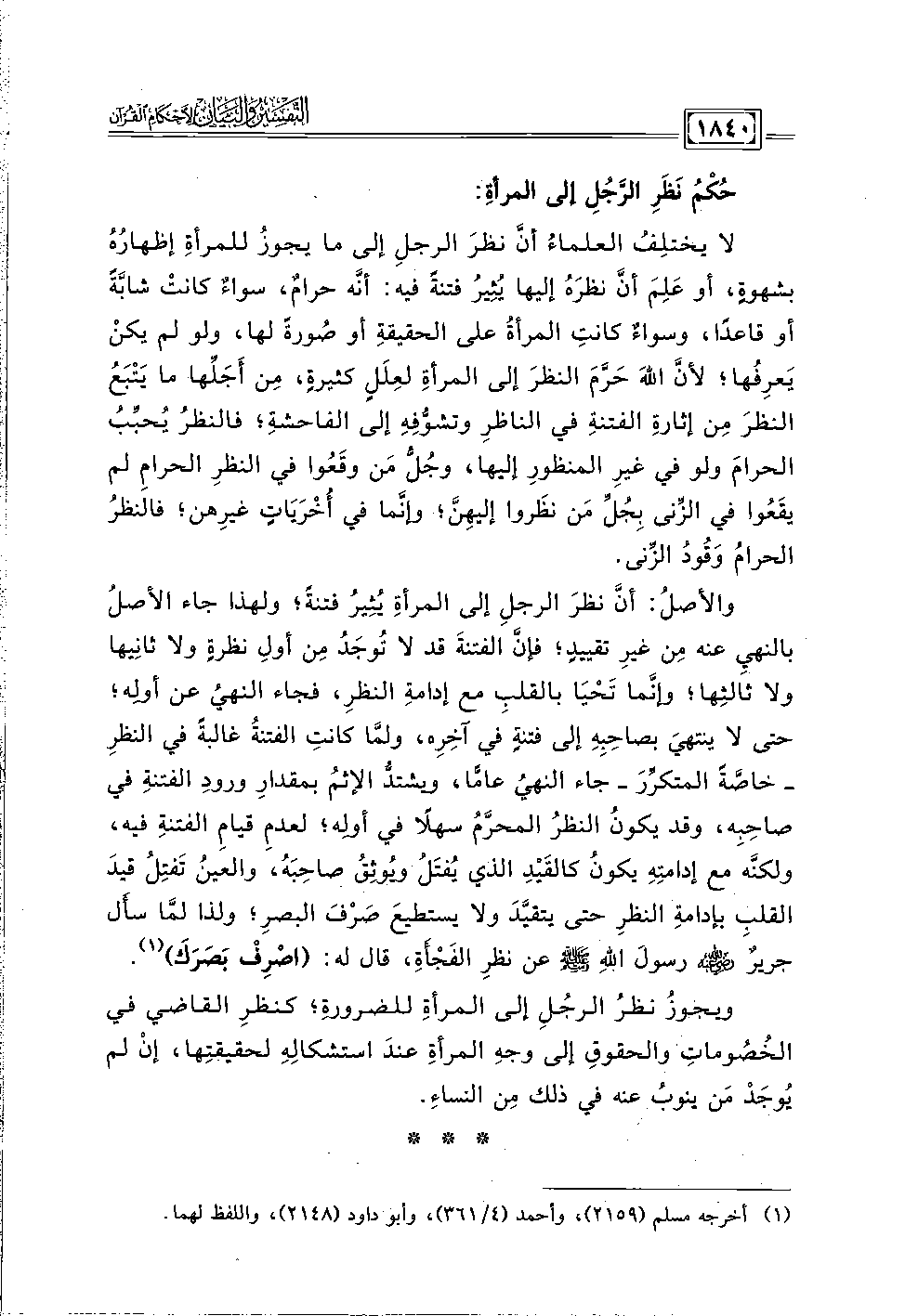 والأصلُ: أنَّ نظرَ الرجلِ إلى المرأةِ يُثِيرُ فتنةً؛ ولهذا جاء الأصلُ بالنهيِ عنه مِن غيرِ تقييدٍ؛ فإنَّ الفتنةَ قد لا تُوجَدُ مِن أولِ نظرةٍ ولا ثانيها ولا ثالثِها؛ وإنَّما تَحْيَا بالقلبِ مع إدامةِ النظرِ، فجاء النهيُ عن أولِه؛ حتى لا ينتهي بصاحِبِهِ إلى فتنةٍ في آخِرِه، ولمَّا كانتِ الفتنةُ غالبةً في النظرِ -خاصَّةَ المتكرِّرَ- جاء النهيُ عامًّا، ويشتدُّ الإثمُ بمقدارِ ورودِ الفتنةِ في صاحِبِه، وقد يكونُ النظرُ المحرَّمُ سهلًا في أولِه؛ لعدمِ قيامِ الفتنةِ فيه، ولكنَّه مع إدامتِهِ يكونُ كالقَيدِ الذي يُفتَلُ ويُوثِقُ صاحِبَهُ، والعينُ تَفتِلُ قيدَ القلب بإدامةِ النظرِ حتى يتقيَّدَ ولا يستطيعَ صَرْفَ البصرِ؛ ولذا لمَّا سأَل جريرٌ -رضي اللَّه عنه- رسولَ اللَّهِ -صلى اللَّه عليه وسلم- عن نظرِ الفَجْأَةِ، قال له: (اصْرِفْ بَصَرَكَ) (١).