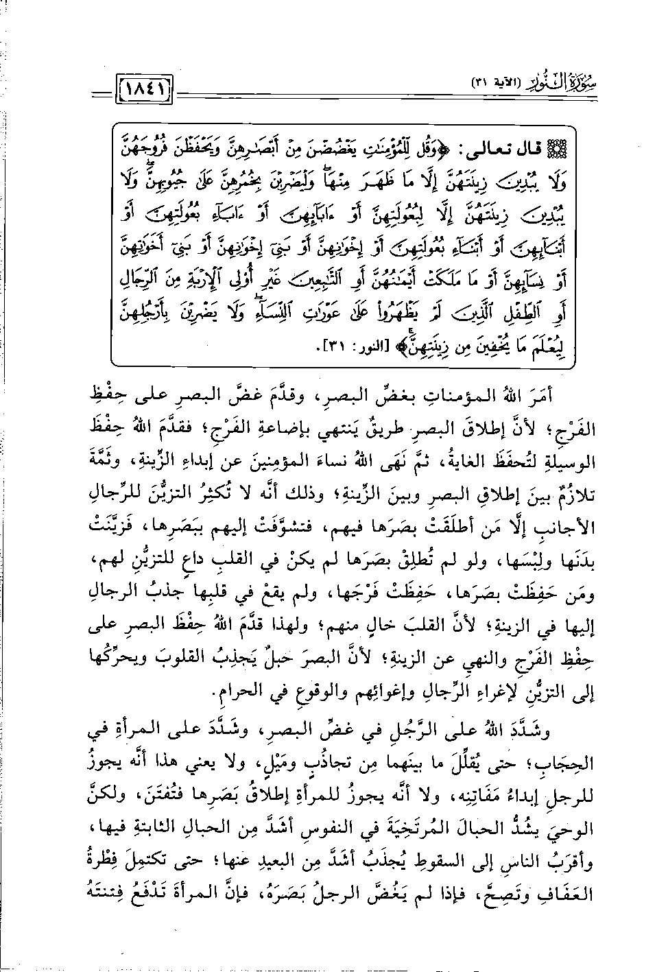 * قال تعالى: {وَقُلْ لِلْمُؤْمِنَاتِ يَغْضُضْنَ مِنْ أَبْصَارِهِنَّ وَيَحْفَظْنَ فُرُوجَهُنَّ وَلَا يُبْدِينَ زِينَتَهُنَّ إِلَّا مَا ظَهَرَ مِنْهَا وَلْيَضْرِبْنَ بِخُمُرِهِنَّ عَلَى جُيُوبِهِنَّ وَلَا يُبْدِينَ زِينَتَهُنَّ إِلَّا لِبُعُولَتِهِنَّ أَوْ آبَائِهِنَّ أَوْ آبَاءِ بُعُولَتِهِنَّ أَوْ أَبْنَائِهِنَّ أَوْ أَبْنَاءِ بُعُولَتِهِنَّ أَوْ إِخْوَانِهِنَّ أَوْ بَنِي إِخْوَانِهِنَّ أَوْ بَنِي أَخَوَاتِهِنَّ أَوْ نِسَائِهِنَّ أَوْ مَا مَلَكَتْ أَيْمَانُهُنَّ أَوِ التَّابِعِينَ غَيْرِ أُولِي الْإِرْبَةِ مِنَ الرِّجَالِ أَوِ الطِّفْلِ الَّذِينَ لَمْ يَظْهَرُوا عَلَى عَوْرَاتِ النِّسَاءِ وَلَا يَضْرِبْنَ بِأَرْجُلِهِنَّ لِيُعْلَمَ مَا يُخْفِينَ مِنْ زِينَتِهِنَّ} [النور: ٣١].