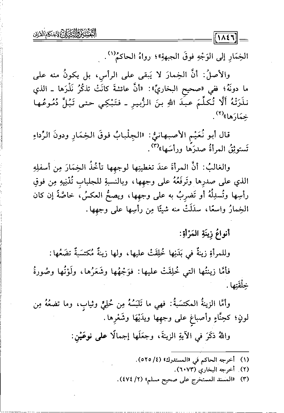 والأصلُ: أنَّ الخِمارَ لا يَبقى على الرأسِ، بل يكونُ منه على ما دونَهُ؛ ففي "صحيحِ البخاريِّ": "أنَّ عائشةَ كانَتْ تذكُرُ نَذْرَها -الذي نذَرَتْهُ ألَّا تُكلِّمَ عبدَ اللَّهِ بنَ الزُّبيرِ- فتَبْكِي حتى تَبُلَّ دُمُوعُها خِمَارَها" (٢).
