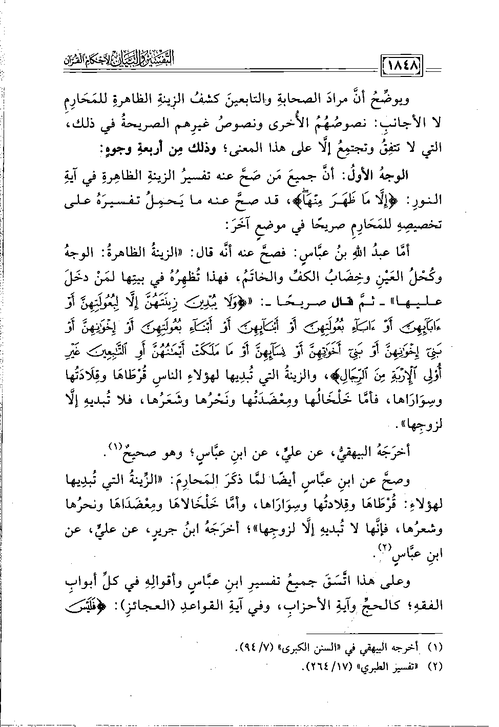 أما عبدُ اللَّهِ بنُ عبَّاسٍ: فصحَّ عنه أنَّه قال: "الزينةُ الظاهرةُ: الوجهُ وكُحْلُ العَيْن وخِضَابُ الكفِّ والخاتَمُ، فهذا تُظهِرُهُ في بيتِها لمَنْ دخَلَ عليها" -ثمَّ قال صريحًا-: {وَلَا يُبْدِينَ زِينَتَهُنَّ إِلَّا لِبُعُولَتِهِنَّ أَوْ آبَائِهِنَّ أَوْ آبَاءِ بُعُولَتِهِنَّ أَوْ أَبْنَائِهِنَّ أَوْ أَبْنَاءِ بُعُولَتِهِنَّ أَوْ إِخْوَانِهِنَّ أَوْ بَنِي إِخْوَانِهِنَّ أَوْ بَنِي أَخَوَاتِهِنَّ أَوْ نِسَائِهِنَّ أَوْ مَا مَلَكَتْ أَيْمَانُهُنَّ أَوِ التَّابِعِينَ غَيْرِ أُولِي الْإِرْبَةِ مِنَ الرِّجَالِ}، والزينةُ التي تُبدِيها لهؤلاءِ الناسِ قُرْطَاهَا وقِلَادَتُها وسِوَارَاها، فأمَّا خَلْخَالُها ومِعْضَدَتُها ونَحْرُها وشَعَرُها، فلا تُبديهِ إلا لزوجِها".