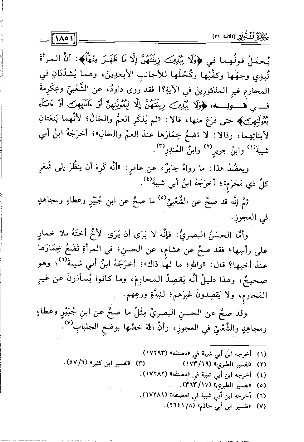 وقد صحَّ عن الحسنِ البصريِّ مِثْلُ ما صحَّ عن ابنِ جُبَيْرٍ وعطاءٍ ومجاهِدٍ والشَّعْبيِّ في العجوزِ، وأنَّ اللَّهَ خصَّها بوضعِ الجلبابِ (٧).