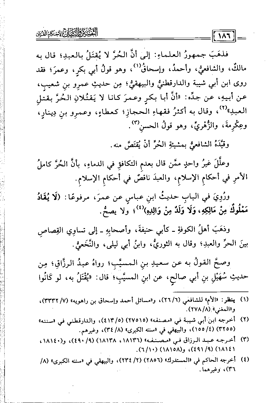 فذهَبَ جمهورُ العلماءِ: إلى أنَّ الحُرَّ لا يُقتَلُ بالعبدِ؛ قال به مالكٌ، والشافعيُّ، وأحمدُ، وإسحاقُ (١)، وهو قولُ أبي بكرٍ، وعمرَ؛ فقد روى ابن أبي شيبة والدارقطنيُّ والبيهقيُّ؛ مِن حديثِ عمرِو بنِ شعيبٍ، عن أبيهِ، عن جدِّه: "أنَّ أبا بكرٍ وعمرَ كانا لا يَقتُلانِ الحُرَّ بقتلِ العبدِ" (٢)، وقال به أكثرُ فقهاءِ الحجازِ؛ كعطاءٍ، وعمرِو بنِ دِينارٍ، وعِكْرِمةَ، والزُّهْريِّ، وهو قولُ الحسنِ (٣).