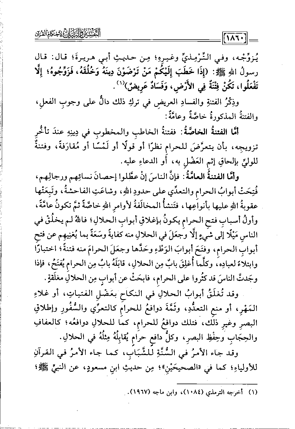 وأمَّا الفتنةُ العامَّةُ: فإنَّ الناسَ إنْ عطَّلوا إحصانَ نسائِهم ورجالِهم، فُتِحَت أبوابُ الحرامِ والتعدِّي على حدودِ اللَّهِ، وشاعَتِ الفاحشةُ، وتَبِعَتْها عقوبةُ اللَّهِ عليها بأنواعِها، فتَنشأُ المخالَفةُ لأوامرِ اللَّهِ خاصَّةً ثمَّ تكون عامَّةً، وأولُ أسبابِ فتحِ الحرامِ يكون بإغلاقِ أبوابِ الحلالِ، فاللَّهُ لم يخلُقْ في الناسِ مَيلًا إلى شيءٍ إلَّا وجعَلَ في الحلالِ منه كفايةً وسَعَةً بما يُغنِيهِم عن فتحِ أبوابِ الحرام، وفتَحَ أبوابَ الوَطْءِ وحَدَّها وجعَلَ الحرامَ منه فتنةً؛ اختبارًا وابتلاءً لعبادِه، وكلَّما أُغلِقَ بابٌ مِن الحلالِ، قابَلَهُ بابٌ مِن الحرامِ يُفتَحُ، فإذا وجَدتَّ الناسَ قد كثُروا على الحرامِ، فابحَثْ عن أبوابٍ مِن الحلالِ مغلَقةٍ.