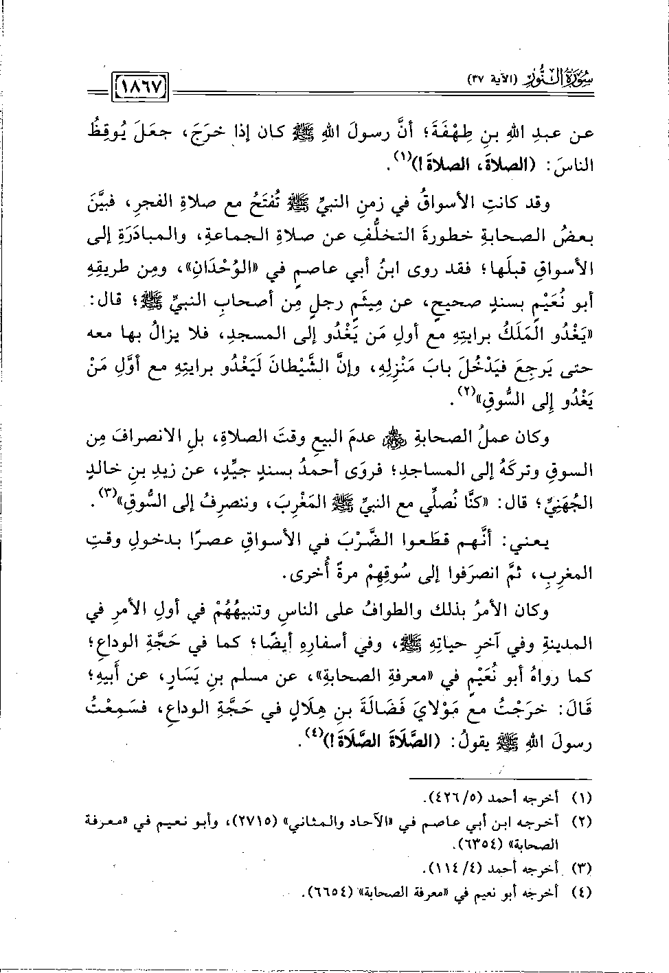 وقد كانتِ الأسواقُ في زمنِ النبيِّ -صلى اللَّه عليه وسلم- تُفتَحُ مع صلاةِ الفجرِ، فبيَّنَ بعضُ الصحابةِ خطورةَ التخلُّفِ عن صلاةِ الجماعةِ، والمبادَرَةِ إلى الأسواقِ قبلَها؛ فقد روى ابنُ أبي عاصمٍ في "الوُحْدَانِ"، ومِن طريقِهِ أبو نُعَيْمِ بسندٍ صحيحٍ، عن مِيثَمٍ رجلٍ مِن أصحابِ النبيِّ -صلى اللَّه عليه وسلم- قال: "يَغْدُو المَلَكُ برايتِهِ مع أولِ مَن يَغدُو إلى المسجدِ، فلا يزالُ بها معه حتى يَرجعَ فيَدْخُلَ بابَ مَنْزِلِهِ، وإنَّ الشيطانَ لَيَغْدُو برايتِهِ مع أوَّلِ مَنْ يَغدُو إلى السُّوقِ" (٢).