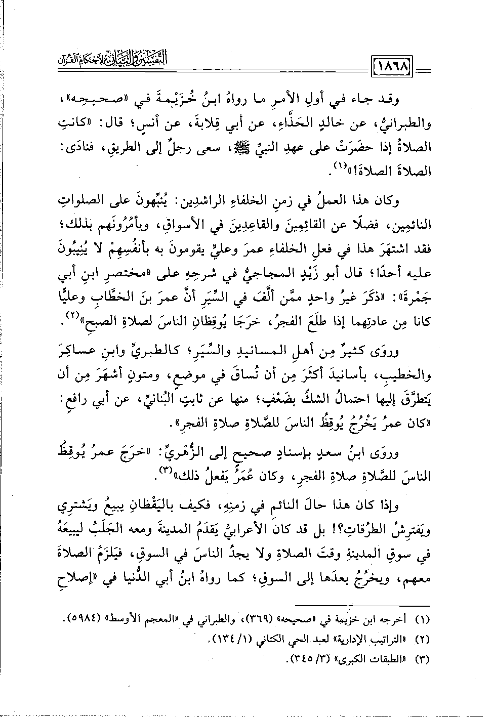 وروَى ابنُ سعدٍ بإسنادٍ صحيحٍ إلى الزُّهريِّ: "خرَجَ عمرُ يُوقِظُ الناسَ للصَّلاةِ صلاةِ الفجرِ، وكان عُمَرُ يَفعلُ ذلك" (٣).