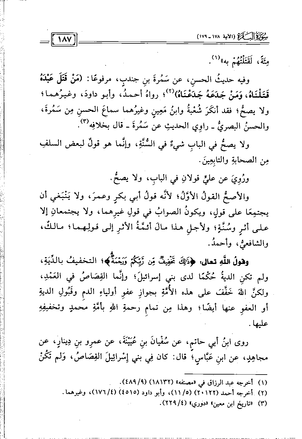 روى ابنُ أبي حاتمٍ، عن سُفْيانَ بنِ عُيَيْنَةَ، عن عمرِو بنِ دِينارٍ، عن مجاهِدٍ، عن ابنِ عَبَّاسٍ؛ قال: كان فِي بني إِسْرائِيلَ القِصَاصُ، وَلم تَكُنْ
