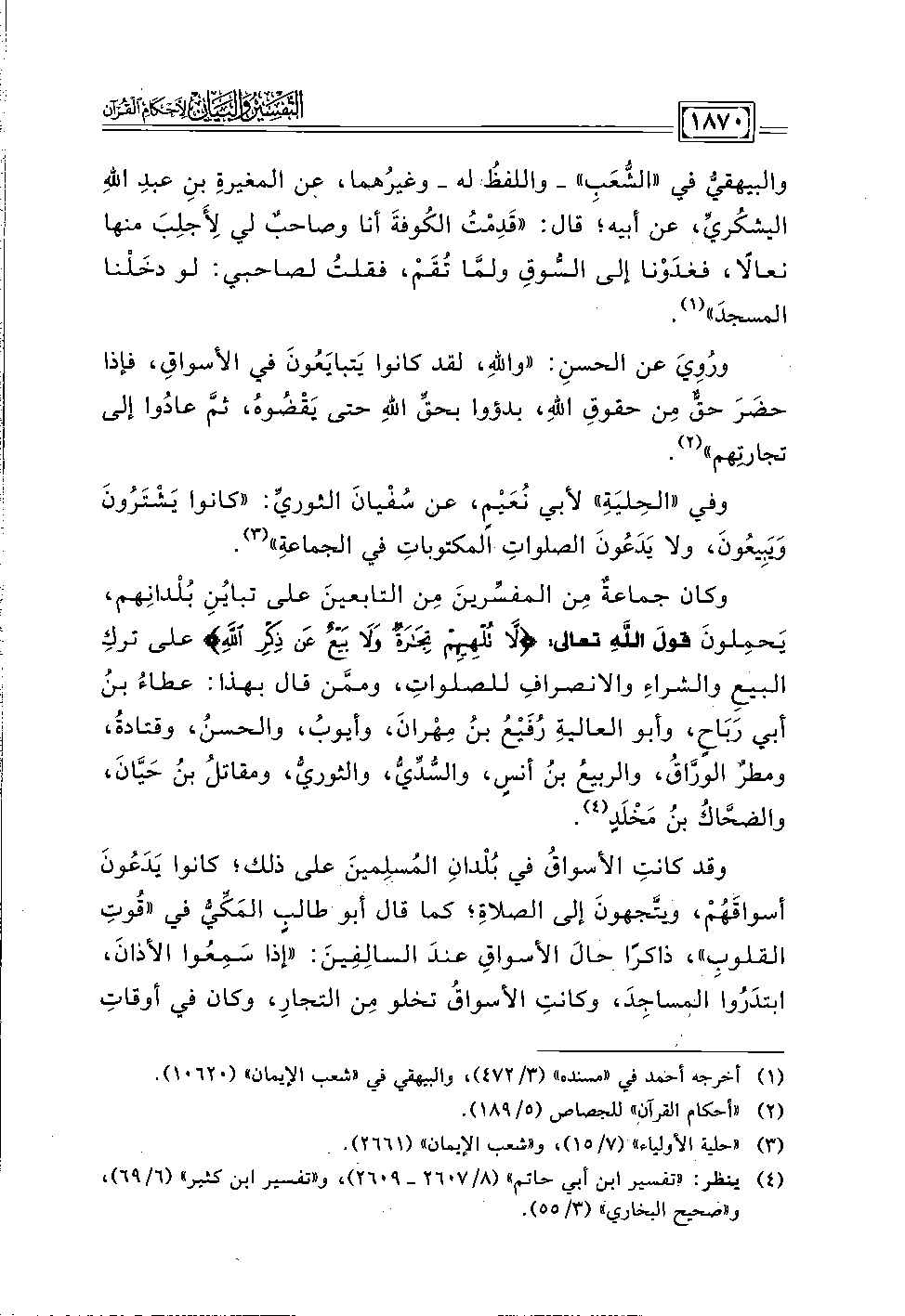 وكان جماعةٌ مِن المفسِّرينَ مِن التابعينَ على تبايُنِ بُلْدانِهم، يَحمِلونَ قولَ اللَّهِ تعالى: {رِجَالٌ لَا تُلْهِيهِمْ تِجَارَةٌ وَلَا بَيْعٌ عَنْ ذِكْرِ اللَّهِ} على تركِ البيعِ والشراءِ والانصرافِ للصلواتِ، وممَّن قال بهذا: عطاءُ بنُ أبي رَبَاحٍ، وأبو العاليةِ رُفَيْعُ بنُ مِهرانَ، وأيوبُ، والحسنُ، وقتادةُ، ومطرٌ الورَّاقُ، والربيعُ بنُ أنسٍ، والسُّدِّيُّ، والثوريُّ، ومقاتلُ بنُ حَيَّانَ، والضحَّاكُ بن مَخْلَدٍ (٤).