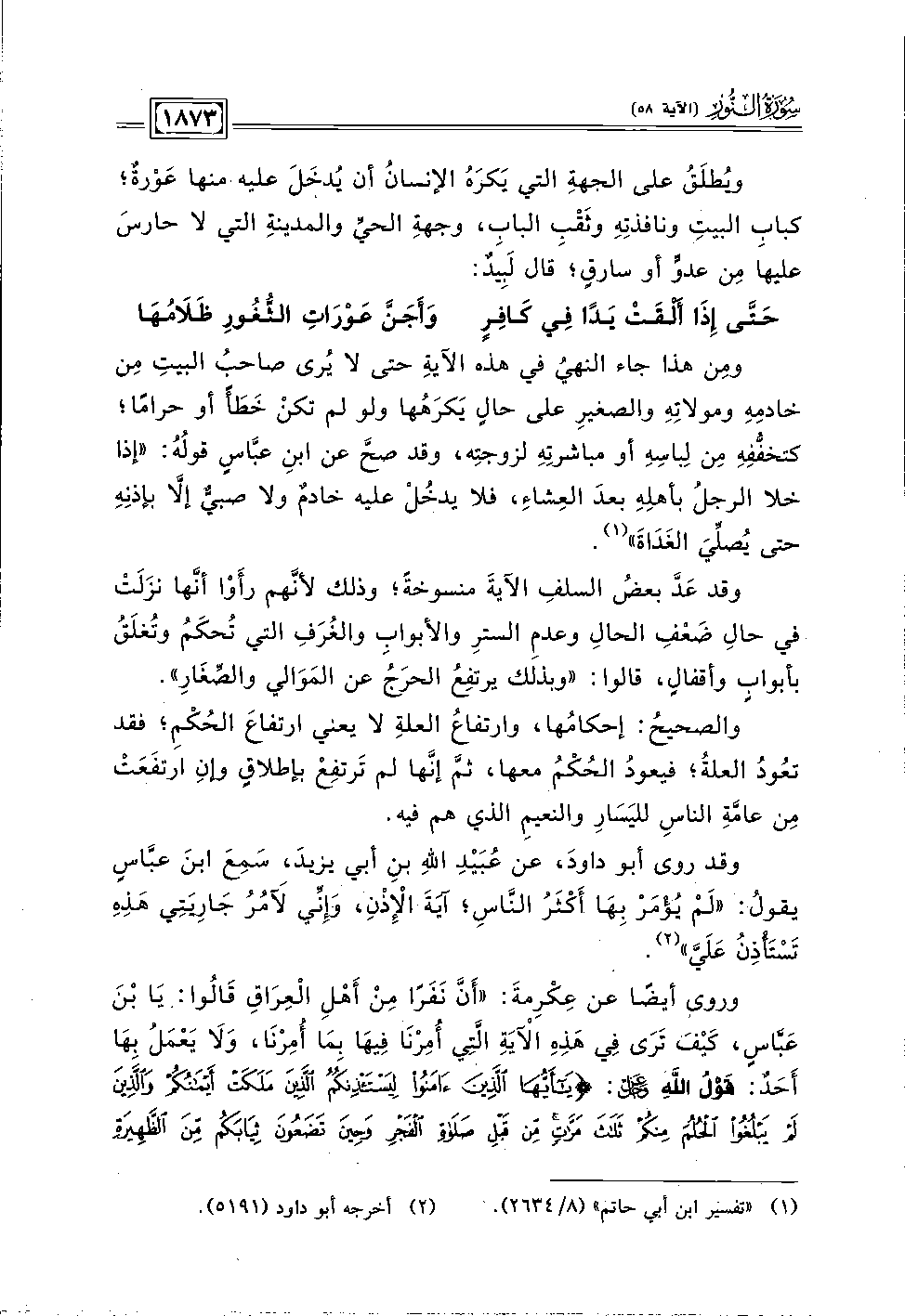 ومن هذا جاء النهيُ في هذه الآيةِ حتى لا يُرى صاحب البيتِ مِن خادمِهِ ومولاتِهِ والصغيرِ على حالِ يَكرَهُها ولو لم تكن خَطَأً أو حرامًا؛ كتخفُّقهِ مِن لِباسِهِ أو مباشرتِهِ لزوجتِه، وقد صحَّ عن ابنِ عبَّاسٍ قولُهُ: "إذا خلا الرجلُ بأهلِهِ بعدَ العِشاءِ، فلا يدخُل عليه خادمٌ ولا صبيٌّ إلَّا بإذنِهِ حتى يُصلِّيَ الغَدَاةَ" (١).