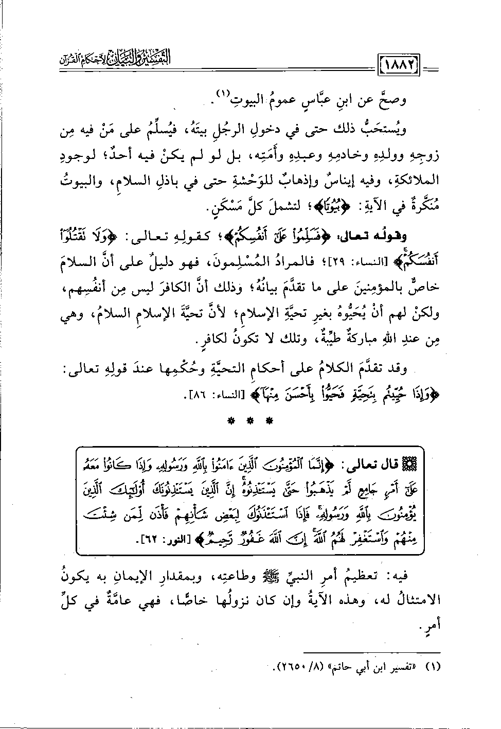 وقولُه تعالى: {فَسَلِّمُوا عَلَى أَنْفُسِكُمْ}؛ كقولِهِ تعالى: {وَلَا تَقْتُلُوا أَنْفُسَكُمْ} [النساء: ٢٩]؛ فالمرادُ المُسْلِمونَ، فهو دليلٌ على أنَّ السلامَ خاصٌّ بالمؤمِنينَ على ما تقدَّمَ بيانُهُ؛ وذلك أنَّ الكافرَ ليس مِن أنفُسِهم، ولكنْ لهم أنْ يُحَيُّوهُ بغيرِ تحيَّةِ الإسلامِ؛ لأنَّ تحيَّةَ الإسلامِ السلامُ، وهي مِن عندِ اللَّهِ مباركةٌ طيِّبةٌ، وتلك لا تكونُ لكافرٍ.