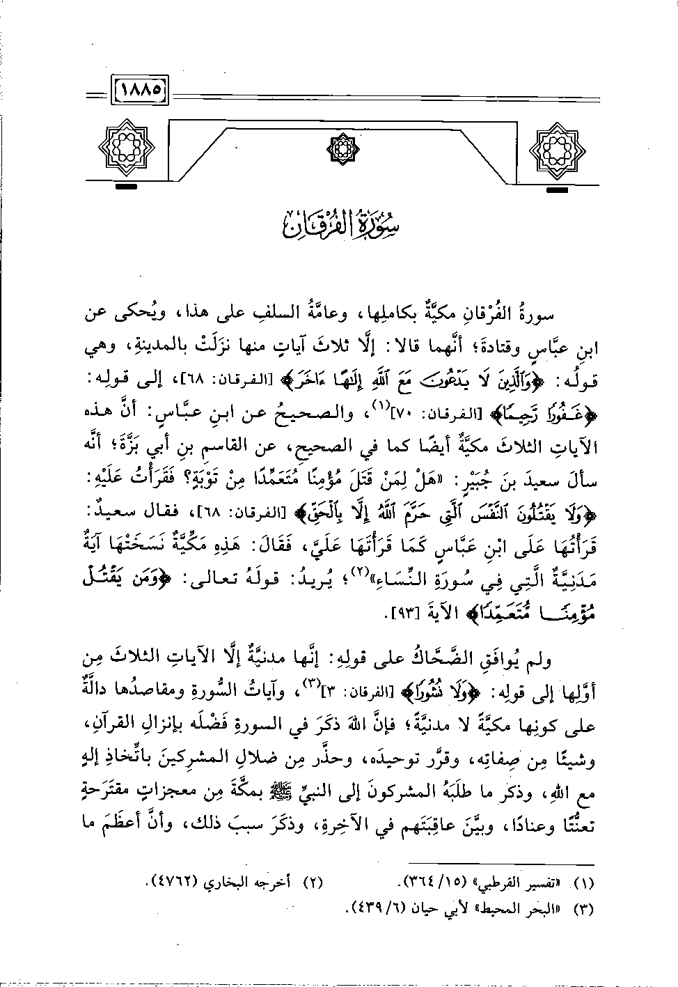 سورةُ الفُرْقانِ مكيَّةٌ بكاملِها، وعامَّةُ السلفِ على هذا، ويُحكى عن ابنِ عبَّاسٍ وقتادةَ؛ أنَّهما قالا: إلَّا ثلاثَ آياتٍ منها نزَلَتْ بالمدينةِ، وهي قولُه: {وَالَّذِينَ لَا يَدْعُونَ مَعَ اللَّهِ إِلَهًا آخَرَ} [الفرقان: ٦٨]، إلى قولِه: {غَفُورًا رَحِيمًا} [الفرقان: ٧٠] (١)، والصحيحُ عن ابنِ عبَّاسٍ: أنَّ هذه الآياتِ الثلاثَ مكيَّةٌ أيضًا كما في الصحيحِ، عن القاسمِ بنِ أبي بَزَّةَ؛ أنَّه سألَ سعيدَ بنَ جُبَيْرٍ: "هَلْ لِمَنْ قَتَلَ مُؤْمِنًا مُتَعَمِّدًا مِنْ تَوْبَةٍ؟ فَقَرَأْتُ عَلَيْهِ: {وَلَا يَقْتُلُونَ النَّفْسَ الَّتِي حَرَّمَ اللَّهُ إِلَّا بِالْحَقِّ} [الفرقان: ٦٨]، فقال سعيدٌ: قَرَأْتُهَا عَلَى ابْنِ عَبَّاسٍ كَمَا قَرَأْتَهَا عَلَيَّ، فَقَالَ: هَذِهِ مَكِّيَّةٌ نَسَخَتْهَا آيَةٌ مَدَنِيَّةٌ الَّتِي فِي سُورَةِ النِّسَاءِ" (٢)؛ يُريدُ: قولَهُ تعالى: {وَمَنْ يَقْتُلْ مُؤْمِنًا مُتَعَمِّدًا} الآيةَ [٩٣].