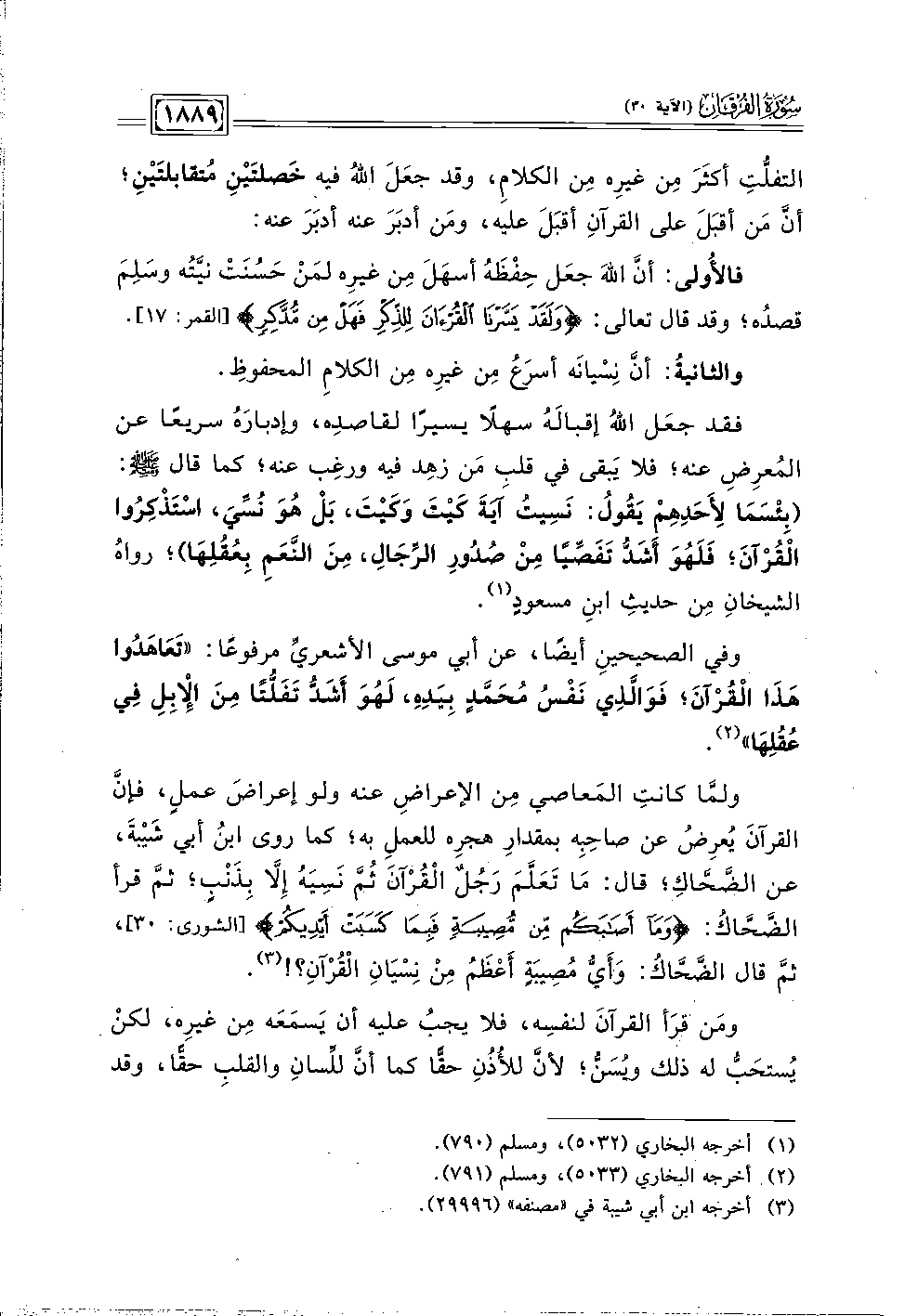 وفي الصحيحينِ أيضًا، عن أبي موسى الأشعريِّ مرفوعًا: "تَعَاهَدُوا هَذَا القُرآنَ؛ فَوَالَّذي نَفسُ مُحَمَّدٍ بِيَدِهِ، لَهُوَ أشَدُّ تَفَلُّتًا مِنَ الإِبِلِ فِي عُقُلِهَا" (٢).