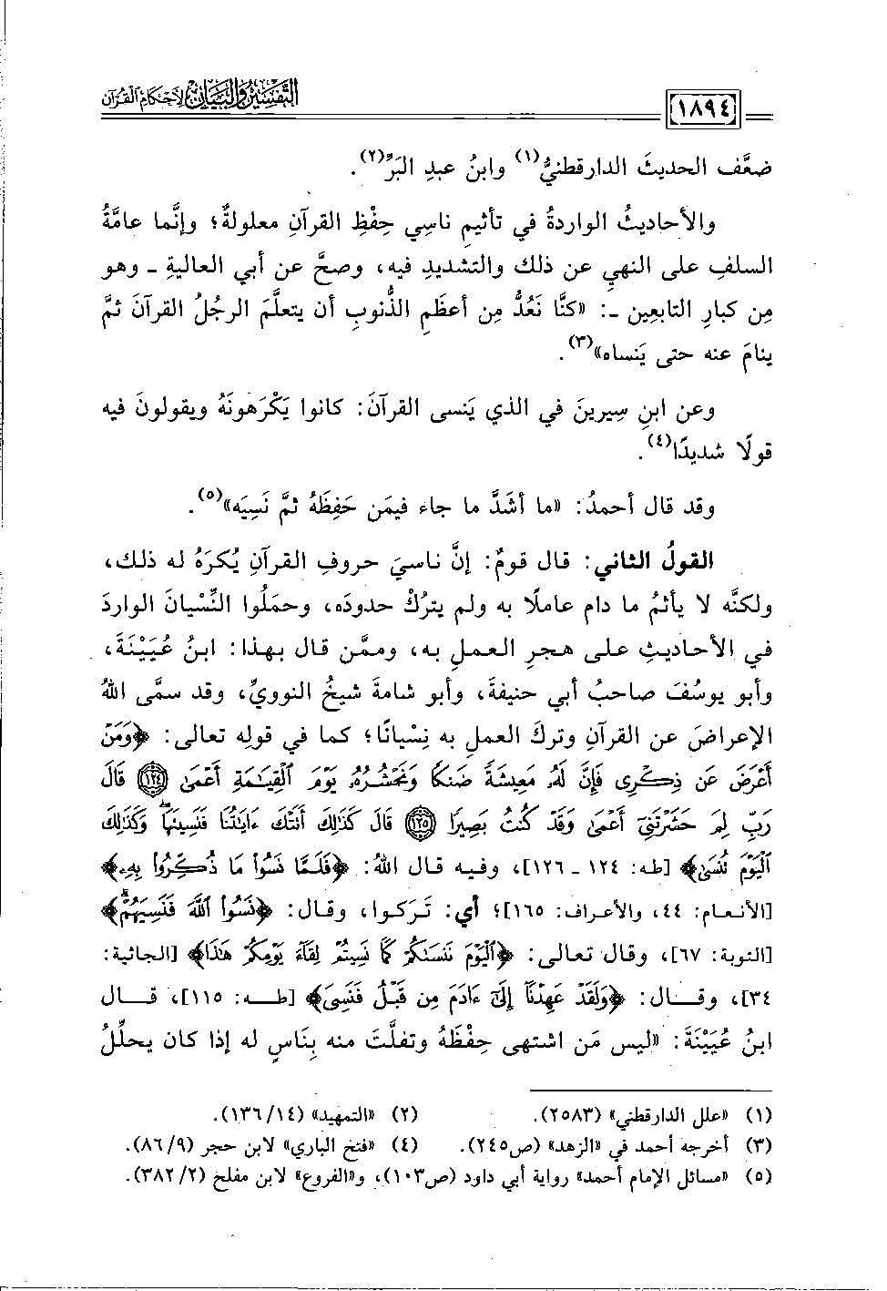 القولُ الثاني: قال قومٌ: إنَّ ناسيَ حروفِ القرآنِ يُكرَهُ له ذلك، ولكنَّه لا يأثمُ ما دام عاملًا به ولم يترُك حدودَه، وحمَلُوا النِّسيانَ الواردَ في الأحاديثِ على هجرِ العملِ به، وممَّن قال بهذا: ابنُ عُيَينَةَ، وأبو يوسُفَ صاحبُ أبي حنيفةَ، وأبو شامةَ شيخُ النوويِّ، وقد سمَّى اللَّهُ الإعراضَ عن القرآنِ وتركَ العمل به نِسْيانًا؛ كما في قولِه تعالى: {وَمَنْ أَعْرَضَ عَنْ ذِكْرِي فَإِنَّ لَهُ مَعِيشَةً ضَنْكًا وَنَحْشُرُهُ يَوْمَ الْقِيَامَةِ أَعْمَى (١٢٤) قَالَ رَبِّ لِمَ حَشَرْتَنِي أَعْمَى وَقَدْ كُنْتُ بَصِيرًا (١٢٥) قَالَ كَذَلِكَ أَتَتْكَ آيَاتُنَا فَنَسِيتَهَا وَكَذَلِكَ الْيَوْمَ تُنْسَى} [طه: ١٢٤ - ١٢٦]، وفيه قال اللَّهُ: {فَلَمَّا نَسُوا مَا ذُكِّرُوا بِهِ} [الأنعام: ٤٤, الأعراف: ١٦٥]، أي: تَرَكوا، وقال {نَسُوا اللَّهَ فَنَسِيَهُمْ} [التوبة: ٦٧]، وقال تعالى: {الْيَوْمَ نَنْسَاكُمْ كَمَا نَسِيتُمْ لِقَاءَ يَوْمِكُمْ هَذَا} [الجاثية: ٣٤]، وقال: {وَلَقَدْ عَهِدْنَا إِلَى آدَمَ مِنْ قَبْلُ فَنَسِيَ} [طه: ١١٥]، قال ابنُ عُيَيْنَةَ: "ليس مَن اشتهى حِفْظَهُ وتفلَّتَ منه بنَاسٍ له إذا كان يحلِّلُ