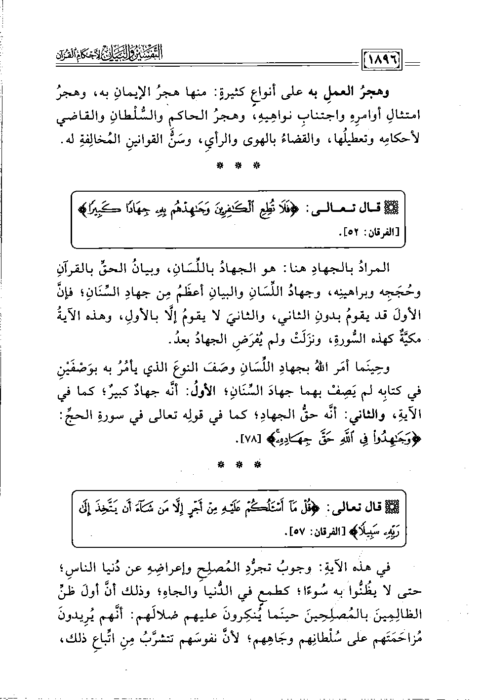 وحِينَما أمَر اللَّهُ بجهادِ اللِّسَانِ وصَفَ النوعَ الذي يأمُرُ به بوَصْفَيْنِ في كتابِه لم يَصِفْ بهما جهادَ السِّنَانِ؛ الأولُ: أنَّه جهادٌ كبيرٌ؛ كما في الآيةِ، والثاني: أنَّه حقُّ الجهادِ؛ كما في قولِه تعالى في سورةِ الحجِّ: {وَجَاهِدُوا فِي اللَّهِ حَقَّ جِهَادِهِ} [٧٨].