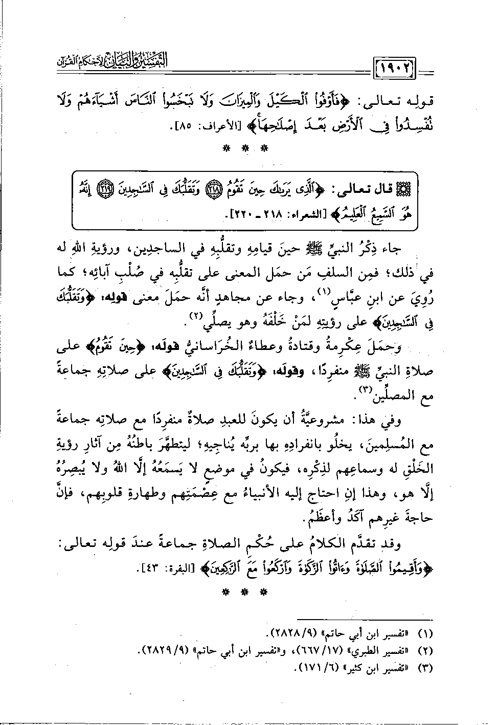 * قال تعالى: {الَّذِي يَرَاكَ حِينَ تَقُومُ (٢١٨) وَتَقَلُّبَكَ فِي السَّاجِدِينَ (٢١٩) إِنَّهُ هُوَ السَّمِيعُ الْعَلِيمُ} [الشعراء: ٢١٨ - ٢٢٠].
