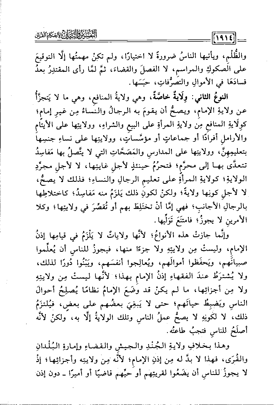 وإنَّما حازتْ هذه الأنواعُ؛ لأنَّها ولاياتٌ لا يَلْزَمُ في قيامِها إذنُ الإمامِ، وليستْ مِن ولايتِهِ ولا جزءًا منها، فيجوزُ للناسِ أن يُعلِّموا صبيانَهم، ويَحفَظوا أموالَهم، ويُعالِجوا أنفسَهم، ويَبْنُوا دُورًا لذلك، ولا يُشترَطُ عندَ الفقهاءِ إذنُ الإمامِ بهذا؛ لأنَّها ليستْ مِن ولايتِهِ ولا مِن أجزائِها، ما لم يكنْ قد وضَعَ الأمامُ نظامًا يُصلِحُ أحوالَ الناسِ ويَضبِطُ حياتَهم؛ حتى لا يَبغِيَ بعضُهم على بعضٍ، فيُلتزَمُ ذلك، لا لكونِهِ لا يصحُّ عمل الناسِ وتلك الولايةُ إلَّا به، ولكنْ لأنَّه أصلَحُ للناسِ فتجبُ طاعتُه.