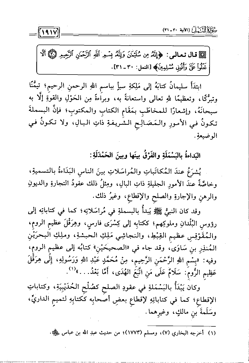ابتدَأَ سليمانُ كتابَهُ إلى مَلِكةِ سبأٍ بباسمِ اللَّهِ الرحمنِ الرحيمِ؛ تيمُّنًا وتبرُّكًا، وتعظيمًا للَّهِ تعالى واستعانةً به، وبراءةً مِن الحَوْلِ والقوةِ إلَّا به سبحانَهُ، وإشعارًا للمخاطَبِ بمَقَامِ الكتابِ والمكتوبِ؛ فإن البسملةَ تكونُ في الأمورِ والمَصَالِحِ الشريفةِ ذاتِ البالِ، ولا تكونُ في الوضيعةِ.