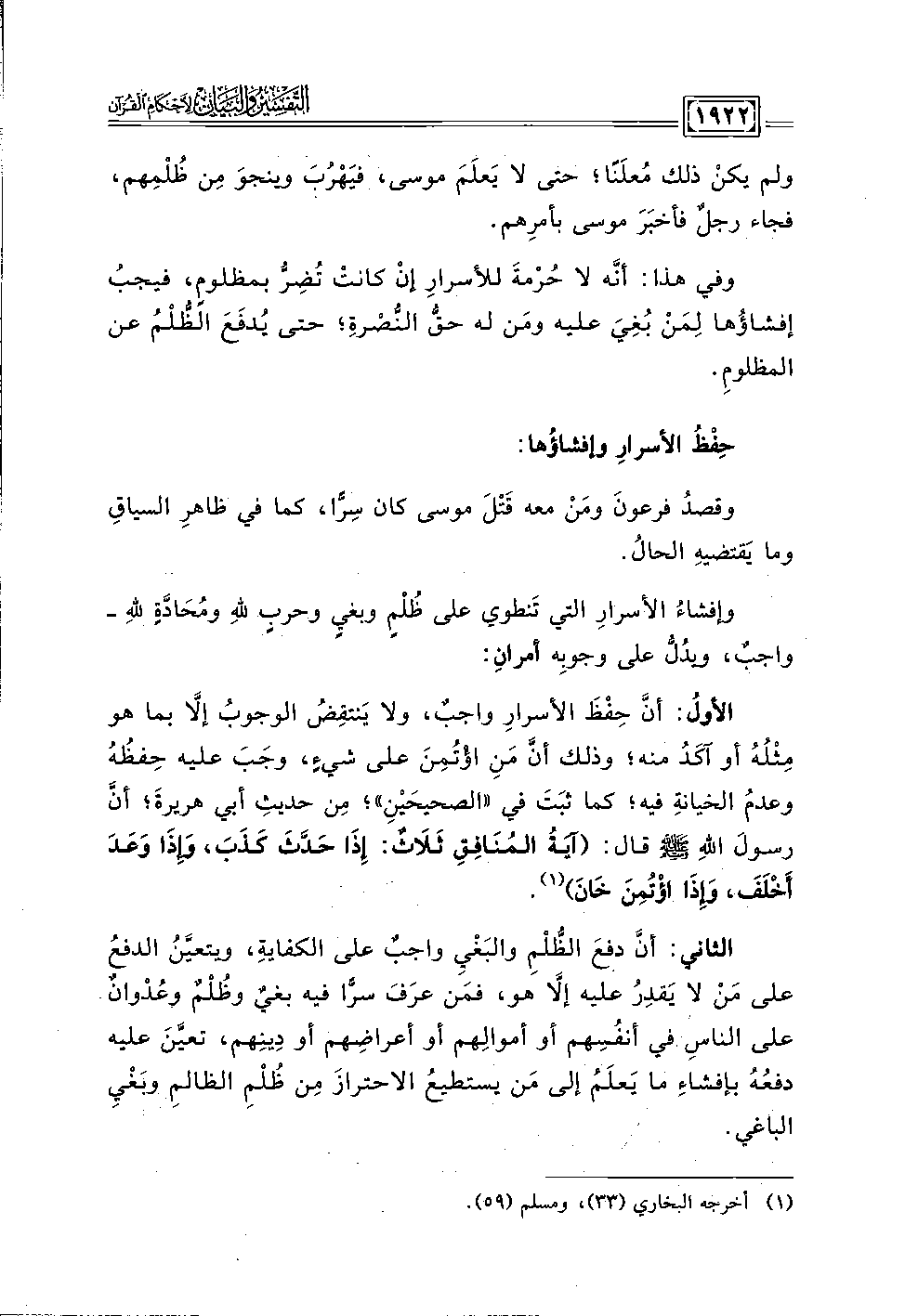 وإفشاءُ الأسرارِ التي تَنطوي على ظُلْمٍ وبغيٍ وحربٍ للَّهِ ومُحَادَّهٍ للَّهِ - واجبٌ، ويدُلُّ على وجوبِه أمرانِ: