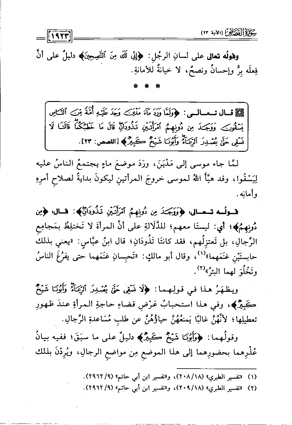 * قال تعالى: {وَلَمَّا وَرَدَ مَاءَ مَدْيَنَ وَجَدَ عَلَيْهِ أُمَّةً مِنَ النَّاسِ يَسْقُونَ وَوَجَدَ مِنْ دُونِهِمُ امْرَأَتَيْنِ تَذُودَانِ قَالَ مَا خَطْبُكُمَا قَالَتَا لَا نَسْقِي حَتَّى يُصْدِرَ الرِّعَاءُ وَأَبُونَا شَيْخٌ كَبِيرٌ} [القصص: ٢٣].