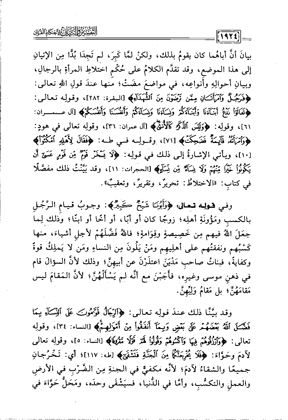 وقد بيَّنَّا ذلك عندَ قولِه تعالى: {الرِّجَالُ قَوَّامُونَ عَلَى النِّسَاءِ بِمَا فَضَّلَ اللَّهُ بَعْضَهُمْ عَلَى بَعْضٍ وَبِمَا أَنْفَقُوا مِنْ أَمْوَالِهِمْ} [النساء: ٣٤]، وقولِه تعالى: {وَارْزُقُوهُمْ فِيهَا وَاكْسُوهُمْ وَقُولُوا لَهُمْ قَوْلًا مَعْرُوفًا} [النساء: ٥]، وقولِه تعالى لآدمَ وحَوَّاءَ: {فَلَا يُخْرِجَنَّكُمَا مِنَ الْجَنَّةِ فَتَشْقَى} [طه: ١١٧]؛ أي: تَخْرُجانِ جميعًا والشقاء لآدمَ؛ لأنَّه مكفيٌّ في الجنةِ مِن الضَّرْب في الأرضِ والعملِ والتكسُّبِ، وأمَّا في الدُّنيا، فسيَشْقَى وحدَه، ومَحَلُّ حَوَّاءَ في