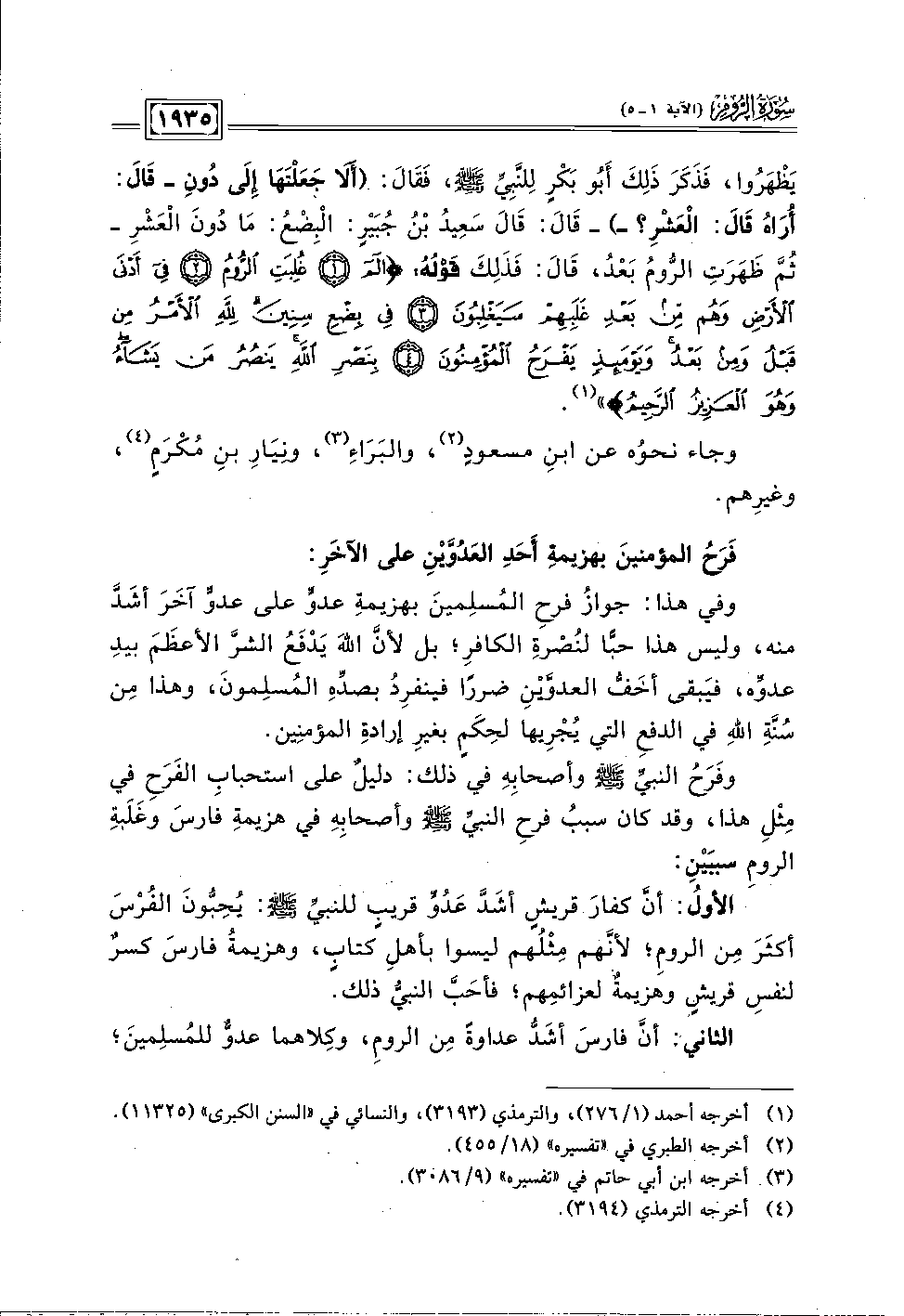 يَظْهَرُوا، فَذَكَرَ ذَلِكَ أَبُو بَكْرٍ لِلنَّبِيِّ -صلى اللَّه عليه وسلم-، فَقَالَ: (أَلَا جَعَلْتَهَا إِلَى دُونِ -قَالَ: أُرَاهُ قَالَ: الْعَشْرِ؟ -) -قَالَ: قَالَ سَعِيدُ بْنُ جُبَيْرٍ: الْبِضْعُ: مَا دُونَ الْعَشرِ- ثُمَّ ظَهَرَتِ الرُّومُ بَعْدُ، قَالَ: فَذَلِكَ قَوْلُهُ: {الم (١) غُلِبَتِ الرُّومُ (٢) فِي أَدْنَى الْأَرْضِ وَهُمْ مِنْ بَعْدِ غَلَبِهِمْ سَيَغْلِبُونَ (٣) فِي بِضْعِ سِنِينَ لِلَّهِ الْأَمْرُ مِنْ قَبْلُ وَمِنْ بَعْدُ وَيَوْمَئِذٍ يَفْرَحُ الْمُؤْمِنُونَ (٤) بِنَصْرِ اللَّهِ يَنْصُرُ مَنْ يَشَاءُ وَهُوَ الْعَزِيزُ الرَّحِيمُ} " (١).
