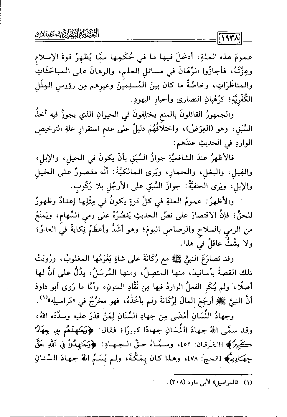عمومَ هذه العلةِ، أدخَلَ فيها ما في حُكْمِها ممَّا يُظهِرُ قوةَ الإسلامِ وعِزَّتَهُ، فأجازُوا الرِّهَانَ في مسائلِ العلمِ، والرهانَ على المباحَثَاتِ والمناظَرَاتِ، وخاصَّةً ما كان بينَ المُسلِمينَ وغيرِهم مِن رؤوسِ المِلَلِ الكُفْرِيَّةِ؛ كرُهْبانِ النصارى وأحبارِ اليهودِ.