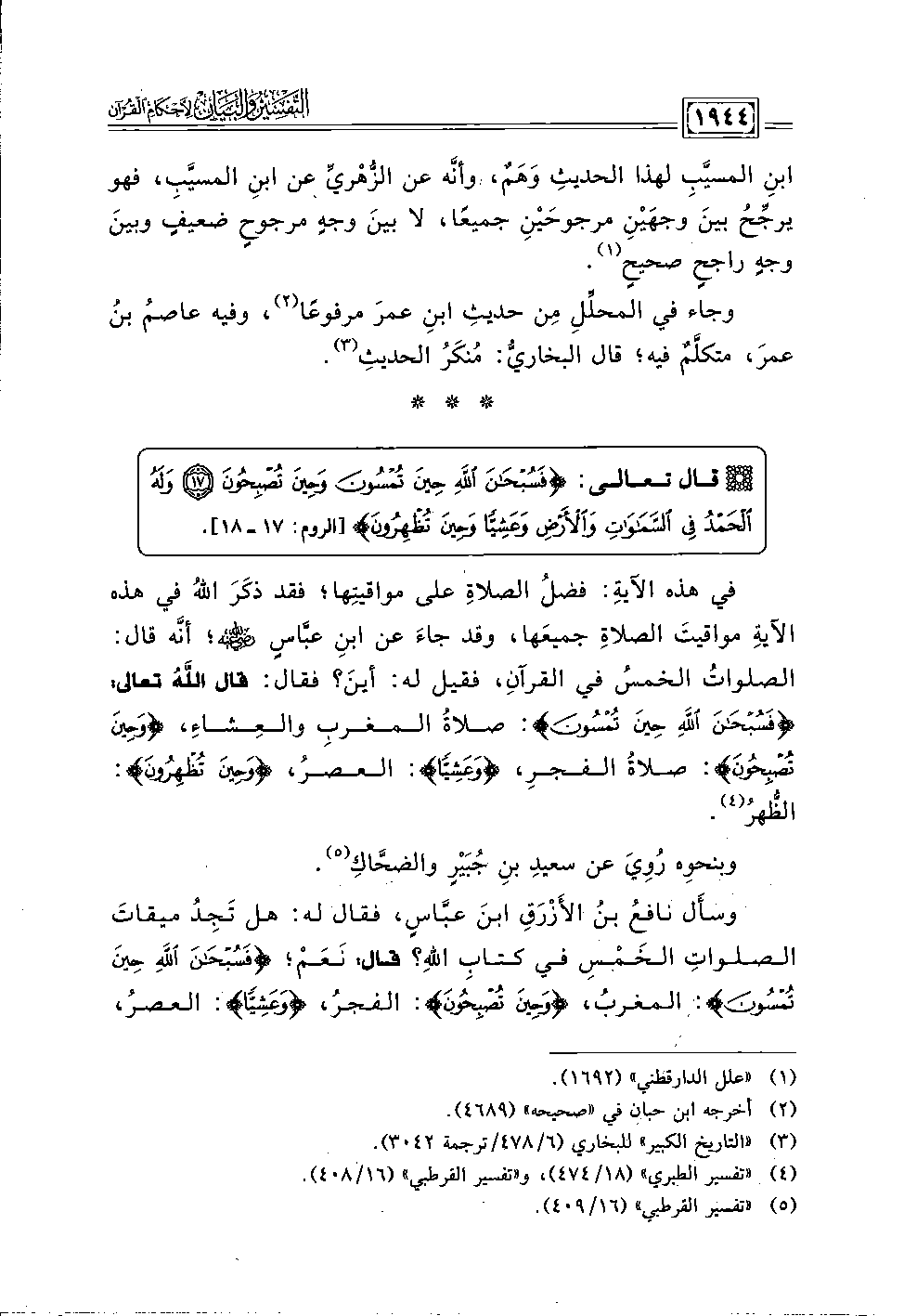 وسأَل نافعُ بنُ الأَزْرَقِ ابنَ عبَّاسٍ، فقال له: هل تَجِدُ ميقاتَ الصلواتِ الخَمْسِ في كتابِ اللَّهِ؟ قال: نَعَمْ؛ {فَسُبْحَانَ اللَّهِ حِينَ تُمْسُونَ}: المغربُ، {وَحِينَ تُصْبِحُونَ}: الفجرُ، {وَعَشِيًّا}: العصرُ،