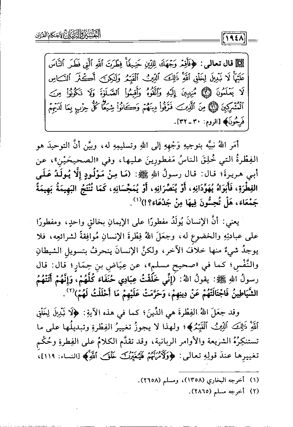 * قال تعالى: {فَأَقِمْ وَجْهَكَ لِلدِّينِ حَنِيفًا فِطْرَتَ اللَّهِ الَّتِي فَطَرَ النَّاسَ عَلَيْهَا لَا تَبْدِيلَ لِخَلْقِ اللَّهِ ذَلِكَ الدِّينُ الْقَيِّمُ وَلَكِنَّ أَكْثَرَ النَّاسِ لَا يَعْلَمُونَ (٣٠) مُنِيبِينَ إِلَيْهِ وَاتَّقُوهُ وَأَقِيمُوا الصَّلَاةَ وَلَا تَكُونُوا مِنَ الْمُشْرِكِينَ (٣١) مِنَ الَّذِينَ فَرَّقُوا دِينَهُمْ وَكَانُوا شِيَعًا كُلُّ حِزْبٍ بِمَا لَدَيْهِمْ فَرِحُونَ} [الروم: ٣٠ - ٣٢].