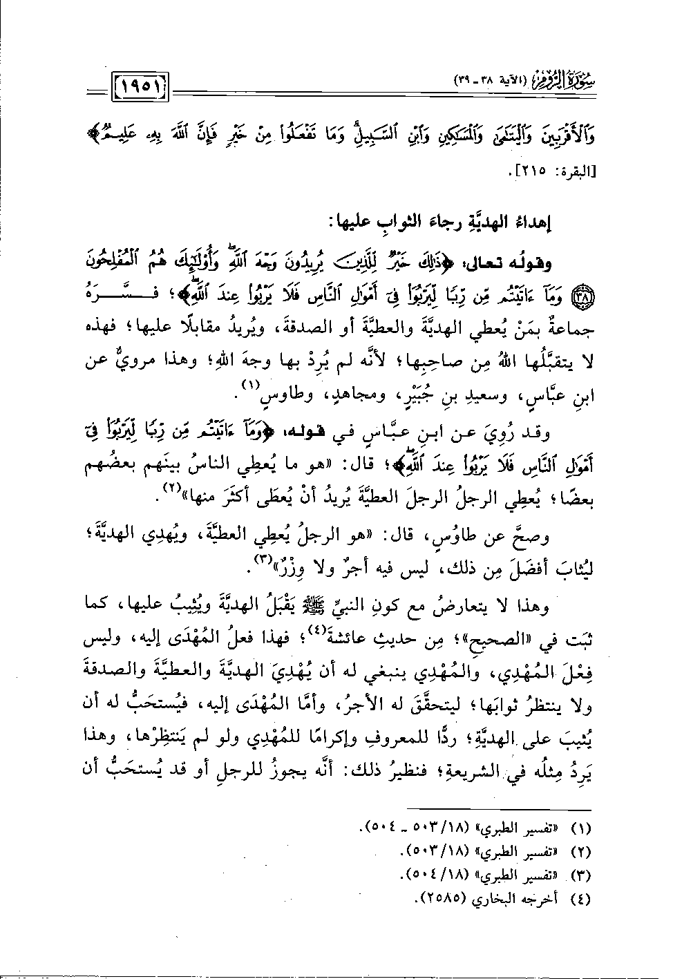 وقوله تعالى: {ذَلِكَ خَيْرٌ لِلَّذِينَ يُرِيدُونَ وَجْهَ اللَّهِ وَأُولَئِكَ هُمُ الْمُفْلِحُونَ (٣٨) وَمَا آتَيْتُمْ مِنْ رِبًا لِيَرْبُوَ فِي أَمْوَالِ النَّاسِ فَلَا يَرْبُو عِنْدَ اللَّهِ}؛ فسَّرَهُ جماعةٌ بمَن يُعطي الهديَّةَ والعطيَّةَ أو الصدقةَ، ويُريدُ مقابلًا عليها؛ فهذه لا يتقبَّلُها اللَّهُ مِن صاحِبِها؛ لأنَّه لم يُرِدْ بها وجهَ اللَّهِ؛ وهذا مرويٌّ عن ابنِ عبَّاسٍ، وسعيدِ بنِ جُبَيْرٍ، ومجاهدٍ، وطاوسٍ (١).
