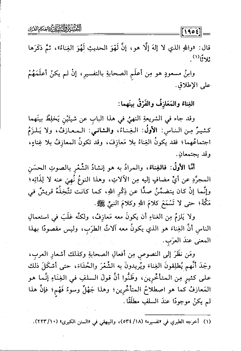 ومَن نظَرَ إلى النصوصِ مِن أفعالِ الصحابةِ وكذلك أشعارِ العربِ، وجَدَ أنَّهم يُطلِقونَ الغِناءَ ويُريدونَ به الشِّعْرَ والحُدَاءَ، حتى أشكَلَ ذلك على كثيرٍ مِن المتأخِّرِين، وظَنُّوا أنَّ قولَ السلفِ في الغِنَاءِ إنَّما هو المَعازفُ كما هو اصطلاحُ المتأخِّرِين؛ وهذا جَهْلٌ وسوءُ فَهْمٍ؛ فإنَّ هذا لم يكنْ موجودًا عندَ السلفِ مطلَقًا.