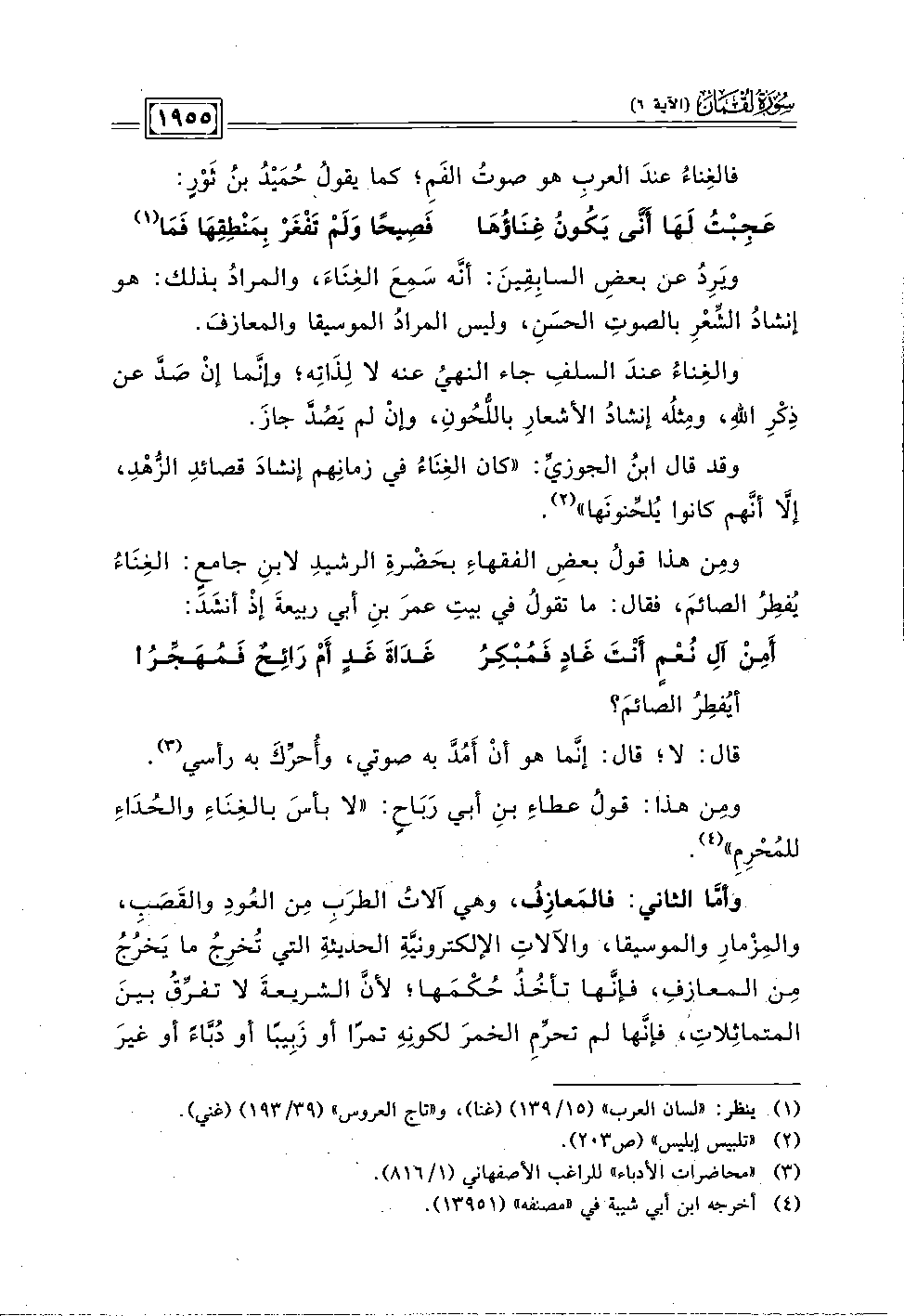 وقد قال ابنُ الجوزيِّ: "كان الغِنَاءُ في زمانِهم إنشادَ قصائدِ الزُّهْدِ، إلَّا أنَّهم كانوا يُلحِّنونَها" (٢).