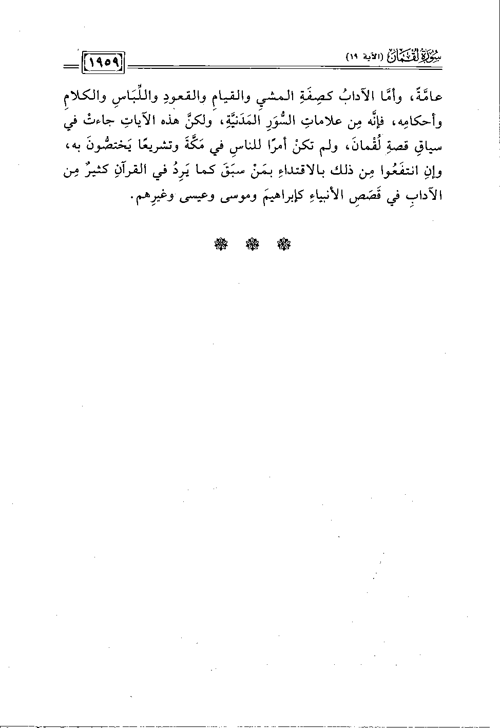 عامَّةً، وأمَّا الآدابُ كصِفَةِ المشي والقيامِ والقعودِ واللِّبَاسِ والكلامِ وأحكامِه، فإنَّه من علاماتِ السُّوَرِ المَدَنيَةِ، ولكنَّ هذه الآياتِ جاءتْ في سياقِ قصةِ لُقْمانَ، ولم تكن أمرًا للناسِ في مَكَّةَ وتشريعًا يَختصُّونَ به، وإنِ انتفَعُوا مِن ذلك بالاقتداءِ بمنْ سبَقَ كما يَرِدُ في القرآنِ كثيرٌ مِن الآداب في قَصَصِ الأنبياءِ كإبراهيمَ وموسى وعيسى وغيرِهم.