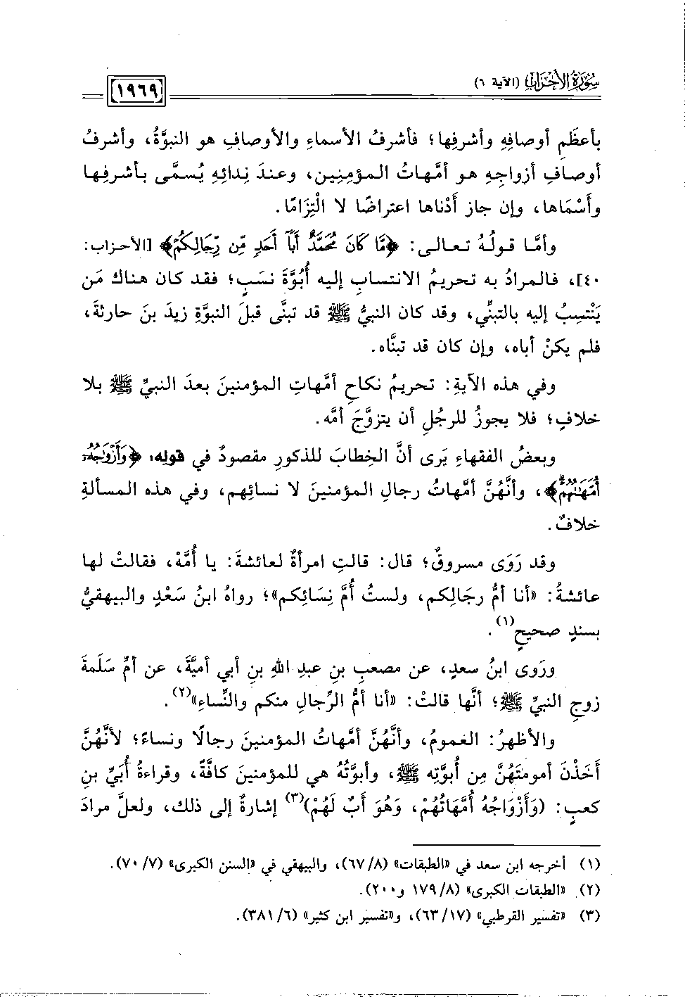 وبعضُ الفقهاءِ يَرى أنَّ الخِطابَ للذكورِ مقصودٌ في قولِه: {وَأَزْوَاجُهُ أُمَّهَاتُهُمْ} , وأنَّهُنَّ أمَّهُاتُ رجالِ المؤمنينَ لا نسائِهم، وفي هده المسألةِ خلافٌ.