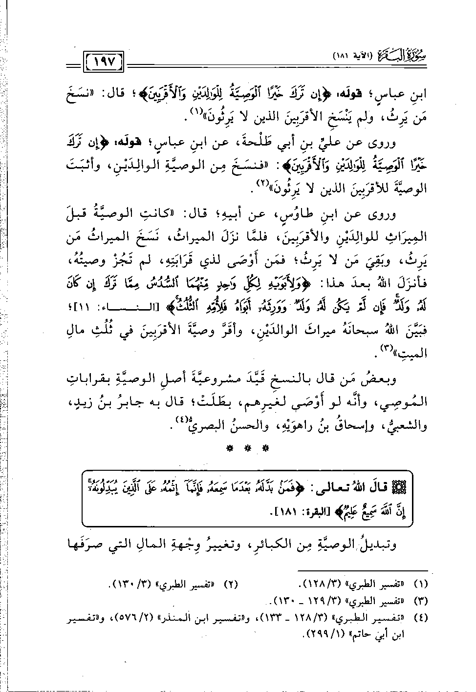ابنِ عباسٍ؛ قولَه: {إِنْ تَرَكَ خَيْرًا الْوَصِيَّةُ لِلْوَالِدَيْنِ وَالْأَقْرَبِينَ}؛ قال: "نسَخَ مَن يَرِثُ، ولم يَنْسَخِ الأقرَبِينَ الذين لا يَرِثُونَ" (١).