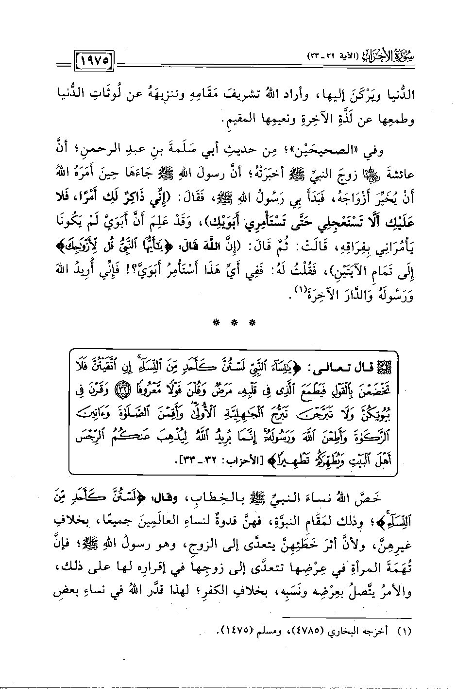 * قال تعالى: {يَانِسَاءَ النَّبِيِّ لَسْتُنَّ كَأَحَدٍ مِنَ النِّسَاءِ إِنِ اتَّقَيْتُنَّ فَلَا تَخْضَعْنَ بِالْقَوْلِ فَيَطْمَعَ الَّذِي فِي قَلْبِهِ مَرَضٌ وَقُلْنَ قَوْلًا مَعْرُوفًا (٣٢) وَقَرْنَ فِي بُيُوتِكُنَّ وَلَا تَبَرَّجْنَ تَبَرُّجَ الْجَاهِلِيَّةِ الْأُولَى وَأَقِمْنَ الصَّلَاةَ وَآتِينَ الزَّكَاةَ وَأَطِعْنَ اللَّهَ وَرَسُولَهُ إِنَّمَا يُرِيدُ اللَّهُ لِيُذْهِبَ عَنْكُمُ الرِّجْسَ أَهْلَ الْبَيْتِ وَيُطَهِّرَكُمْ تَطْهِيرًا (٣٣)} [الأحزاب: ٣٢ - ٣٣].