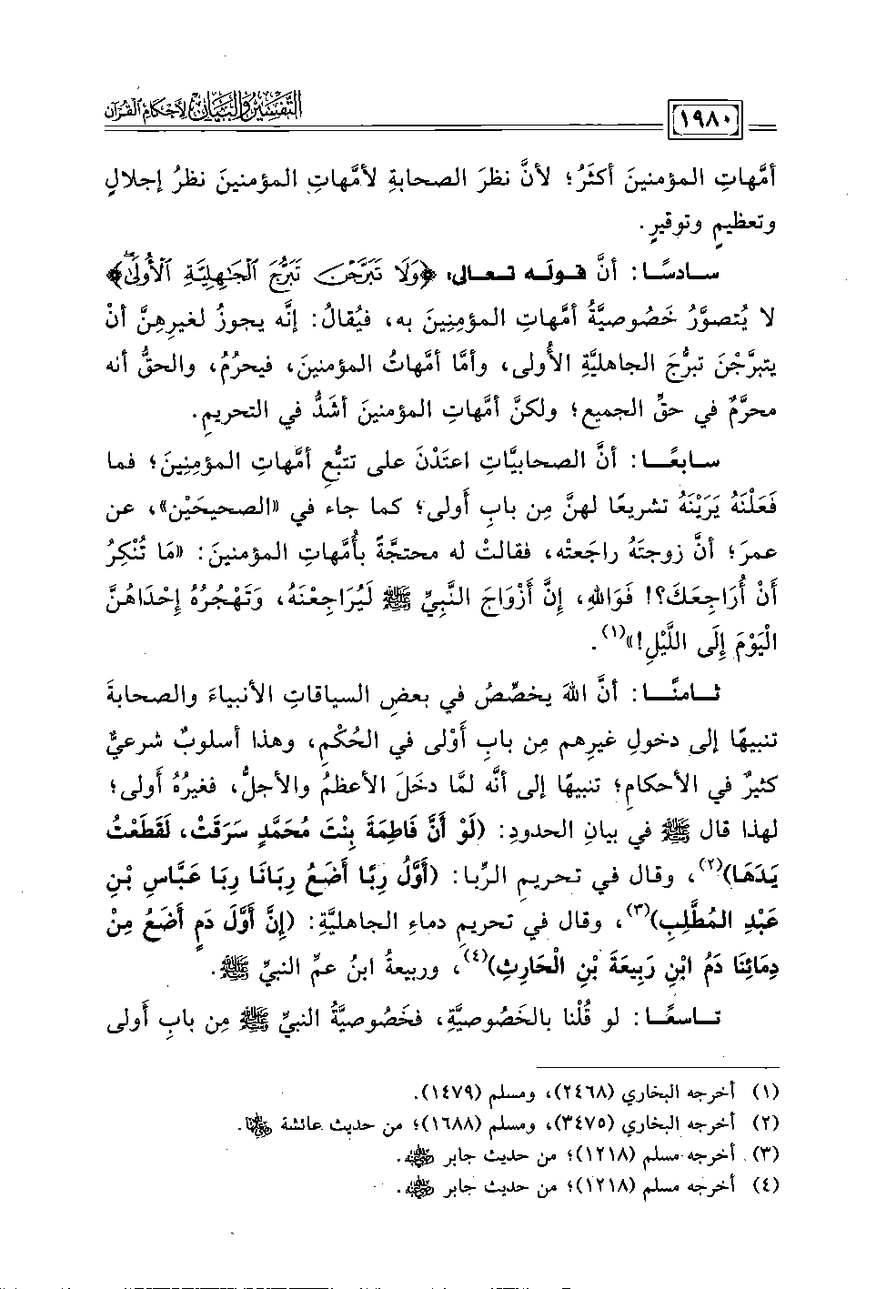 سادسًا: أنَّ قولَه تعالى: {وَلَا تَبَرَّجْنَ تَبَرُّجَ الْجَاهِلِيَّةِ الْأُولَى} لا يُتصوَّرُ خَصُوصيَّةُ أمَّهاتِ المؤمِنِينَ به، فيُقالُ: إنَّه يجوزُ لغيرِهِنَّ أنْ يتبرَّجْنَ تبرُّج الجاهليَّةِ الأُولى، وأمَّا أمَّهاتُ المؤمنينَ، فيحرُمُ، والحقُّ أنَّه محرَّمٌ في حقِّ الجميع؛ ولكنَّ أمَّهاتِ المؤمنينَ أشَدُّ في التحريمِ.