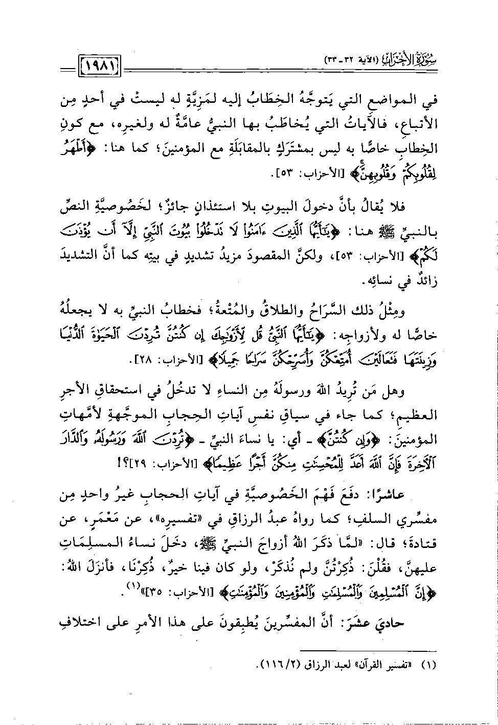 عاشرًا: دفَعَ فَهْمَ الخَصُوصيَّةِ في آياتِ الحجاب غيرُ واحدٍ مِن مفسِّري السلفِ؛ كما رواهُ عبدُ الرزاقِ في "تفسيرِه"، عن مَعْمَرٍ، عن قتادةَ؛ قال: "لمَّا ذكَرَ اللَّهُ أزواجَ النبيِّ -صلى اللَّه عليه وسلم-، دخَلَ نساءُ المسلِمَاتِ عليهنَّ، فقُلْنَ: ذُكِرْتُنَّ ولم نُذكَرْ، ولو كان فينا خيرٌ، ذُكِرْنَا، فأنزَلَ اللَّهُ: {إِنَّ الْمُسْلِمِينَ وَالْمُسْلِمَاتِ وَالْمُؤْمِنِينَ وَالْمُؤْمِنَاتِ} [الأحزاب: ٣٥] " (١).