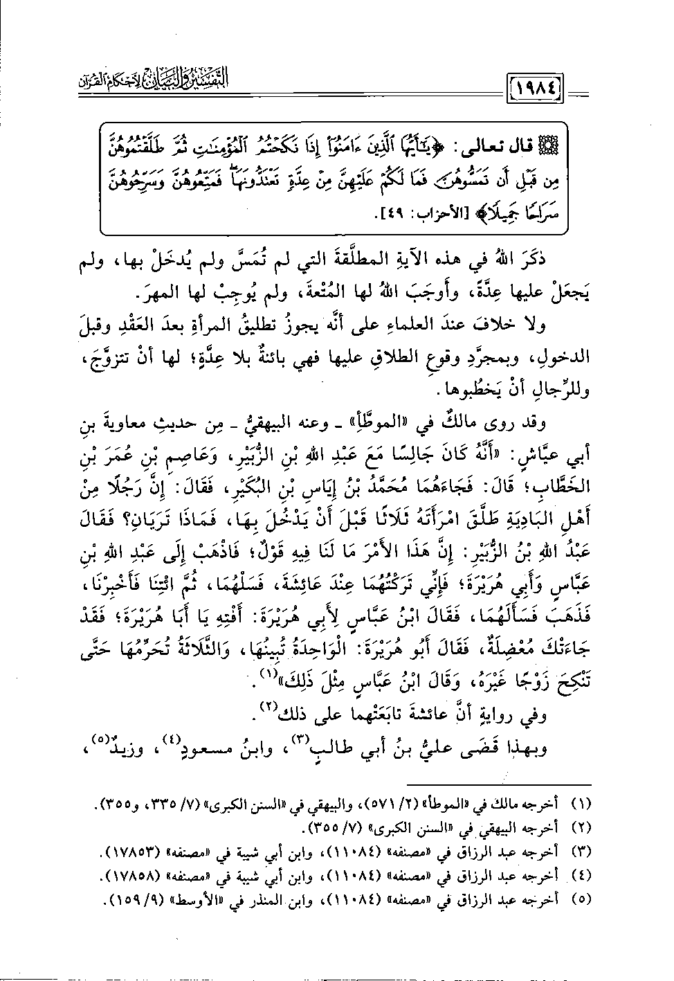 وقد روى مالكٌ في "الموطَّأِ" -وعنه الببهقيُّ- مِن حديثِ معاويةَ بنِ أبي عيَّاشٍ: "أَنَّهُ كَانَ جَالِسًا مَعَ عَبْدِ اللَّهِ بْنِ الزُّبَيْرِ، وَعَاصِمِ بْنِ عُمَرَ بْنِ الخَطَّابِ؛ قَالَ: فَجَاءَهُمَا مُحَمَّدُ بْنُ إِيَاسِ بْنِ البُكَيْرِ، فَقَالَ: إِنَّ رَجُلًا مِنْ أَهْلِ البَادِيَةِ طَلَّقَ امْرَأَتَهُ ثَلَاثًا قَبْلَ أَنْ يَدْخُلَ بِهَا، فَمَاذَا تَرَيَانِ؟ فَقَالَ عَبْدُ اللَّهِ بْنُ الزُّبَيْرِ: إِنَّ هَذَا الأَمْرَ مَا لَنَا فِيهِ قَوْلٌ؛ فَاذْهَبْ إِلَى عَبْدِ اللَّهِ بْنِ عَبَّاسٍ وَأَبِي هُرَيْرَةَ؛ فَإِنِّي تَرَكْتُهُمَا عِنْدَ عَائِشَةَ، فَسَلْهُمَا، ثُمَّ ائْتِنَا فَأَخْبِرْنَا، فَذَهَبَ فَسَأَلَهُمَا، فَقَالَ ابْنُ عَبَّاسٍ لِأَبِي هُرَيْرَةَ: أَفْتِهِ يَا أَبَا هُرَيْرَةَ؛ فَقَدْ جَاءَتْكَ مُعْضِلَةٌ، فَقَالَ أَبُو هُرَيْرَةَ: الْوَاحِدَةُ تُبِينُهَا، وَالثَّلَاثَةُ تُحَرَّمُهَا حَتَّى تَنْكِحَ زَوْجًا غَيْرَهُ، وَقَالَ ابْنُ عَبَّاسٍ مِثْلَ ذَلِكَ" (١).