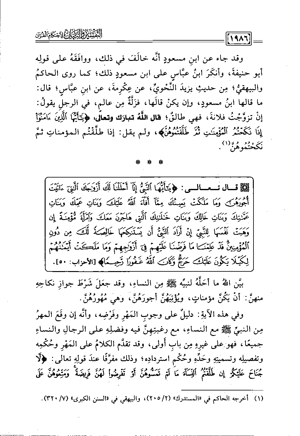 * قال تعالى: {يَاأَيُّهَا النَّبِيُّ إِنَّا أَحْلَلْنَا لَكَ أَزْوَاجَكَ اللَّاتِي آتَيْتَ أُجُورَهُنَّ وَمَا مَلَكَتْ يَمِينُكَ مِمَّا أَفَاءَ اللَّهُ عَلَيْكَ وَبَنَاتِ عَمِّكَ وَبَنَاتِ عَمَّاتِكَ وَبَنَاتِ خَالِكَ وَبَنَاتِ خَالَاتِكَ اللَّاتِي هَاجَرْنَ مَعَكَ وَامْرَأَةً مُؤْمِنَةً إِنْ وَهَبَتْ نَفْسَهَا لِلنَّبِيِّ إِنْ أَرَادَ النَّبِيُّ أَنْ يَسْتَنْكِحَهَا خَالِصَةً لَكَ مِنْ دُونِ الْمُؤْمِنِينَ قَدْ عَلِمْنَا مَا فَرَضْنَا عَلَيْهِمْ فِي أَزْوَاجِهِمْ وَمَا مَلَكَتْ أَيْمَانُهُمْ لِكَيْلَا يَكُونَ عَلَيْكَ حَرَجٌ وَكَانَ اللَّهُ غَفُورًا رَحِيمًا (٥٠)} [الأحزاب: ٥٠].